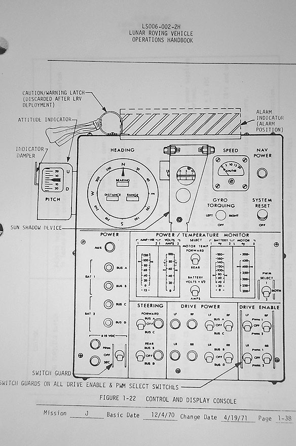 [The LRV power-up configuration is shown in the LRV Operations Decal, which is Figure 3.7-9 in the Lunar Surface Procedures volume. See, also, Figure 1-22 in the LRV Operations Handbook and the accompanying MSFC photo, which show the console.]166:05:39 Young: PMW (means PWM) is in Both. And the Drive Enable is in...All those switches are up. And the steering is okay. Going to Primary. (Pause) Coming around for a Nav align. (Pause)