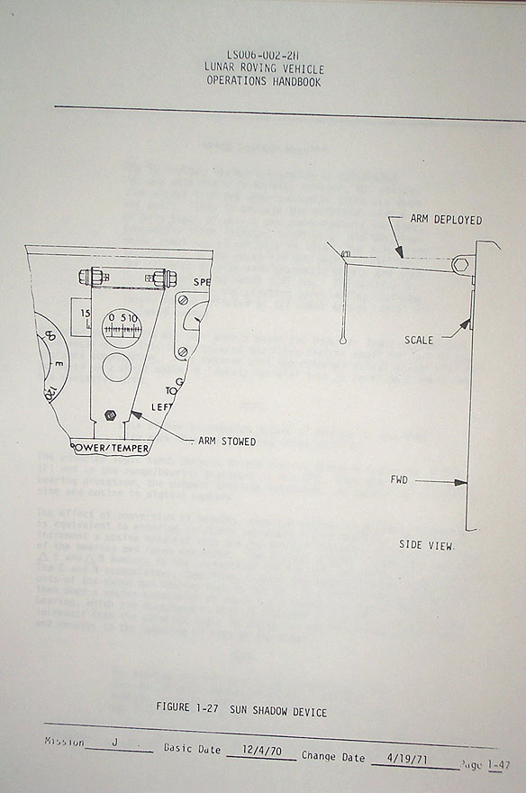 [During the drive up Stone Mountain to Station 4, the pitch scale de-bonded and fell into the bottom of the instrument, but the indicator needle stayed in place. John got used to the pitch indicator during training and can estimate his pitch from the position of the needle relative to the case.]166:07:04 Young: What happened on that indicator is that the dial has falling off, if you can believe such a thing. The little needle is still back there. It don't know the dial's fallen off, and it's working fine. One degree right roll. ...
