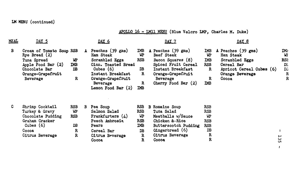 [Details for the meals can be found in the LM Menu given in the Apollo 16 Press Kit ( 5.6 Mb PDF ).]162:49:34 Peterson: Roger. And we estimate John slept 6 and a half to 7 hours.[Journal Contributor Brian Lawrence comments "I must admit I didn't know what 'romaine soup' was - neither did Gill - but a bit of research revealed that romaine is a variety of lettuce. If that's what the soup was made from, I'm not surprised that neither John nor Charlie ate it!"]