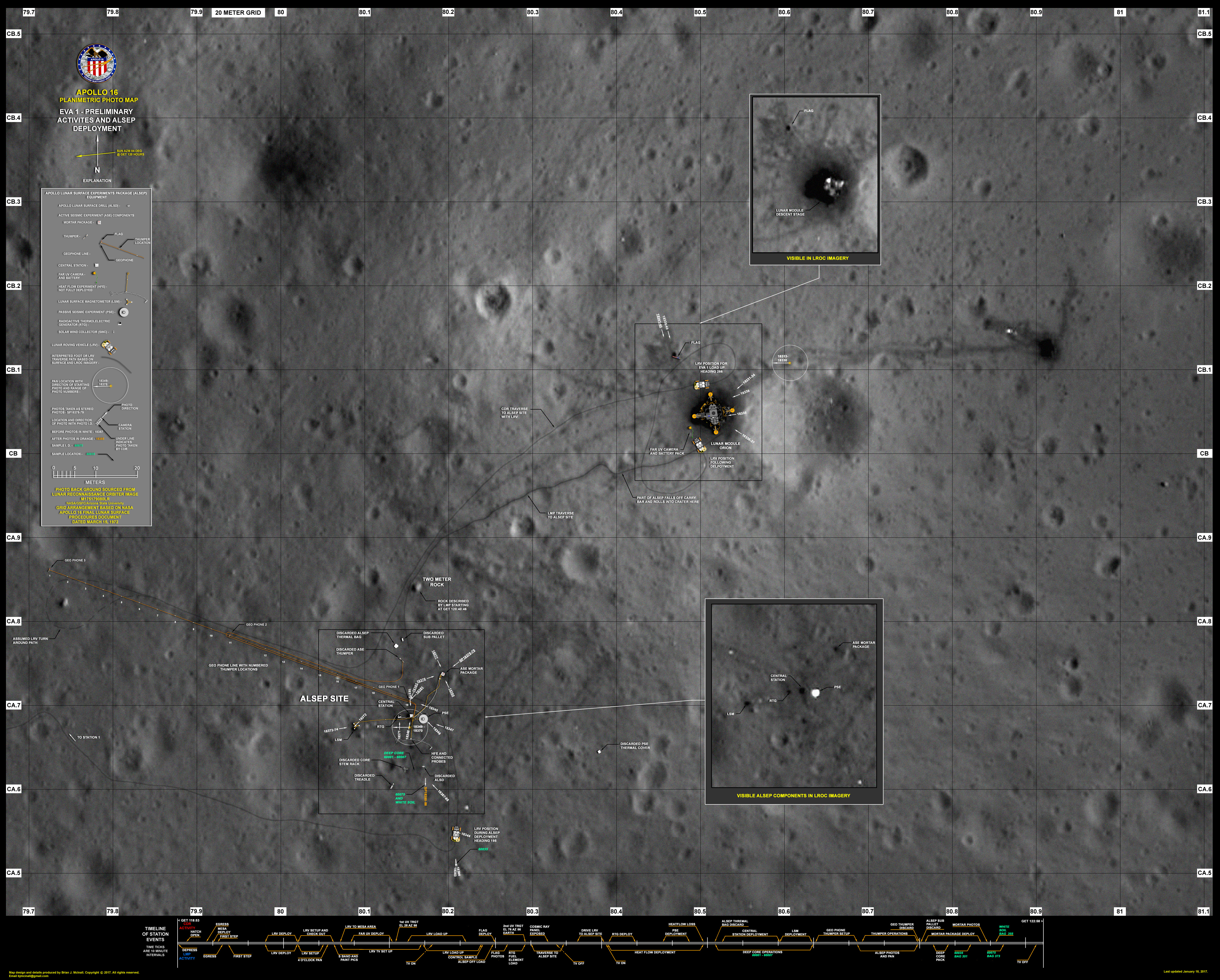 [Charlie is holding the drill by a wire loop and puts the drill down so that he can remove the drill stems from the bag.]121:06:29 Young: And we may have to deploy the LSM out behind the ALSEP anyway to get it from going down in that little crater there. I think 50 foot (west as per 3.4-3) will put me right in that hole. What do you think of that, Houston, if I deploy the LSM behind Charlie's thing here? Can y'all see this on the tube (meaning the TV)? (Pause)