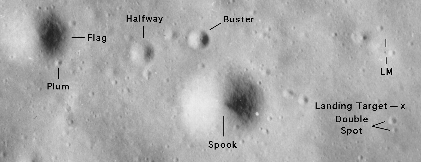 [As indicated in the "EVA-I, III; 1 of 3" map, the larger of the Double Spot Craters is near BZ.6/80.7. John had planned to land at CA.0/81.0 and, as indicated in Figure 6-15 from the Preliminary Science Report, he actually landed near CB.1/80.6. See, also, a detail from Pan Camera frame AS16-4618. The ALSEP Central Station is near CA.7/80.2. They are about 220 meters north and slightly west of Double Spot.]120:56:40 Young: Let's see, there's the craters. (Pause) Okay. (Pause)[When the white ejecta blanket surrounding South Ray Crater comes into view, Fendell stops his clockwise pan and reverses direction.]
