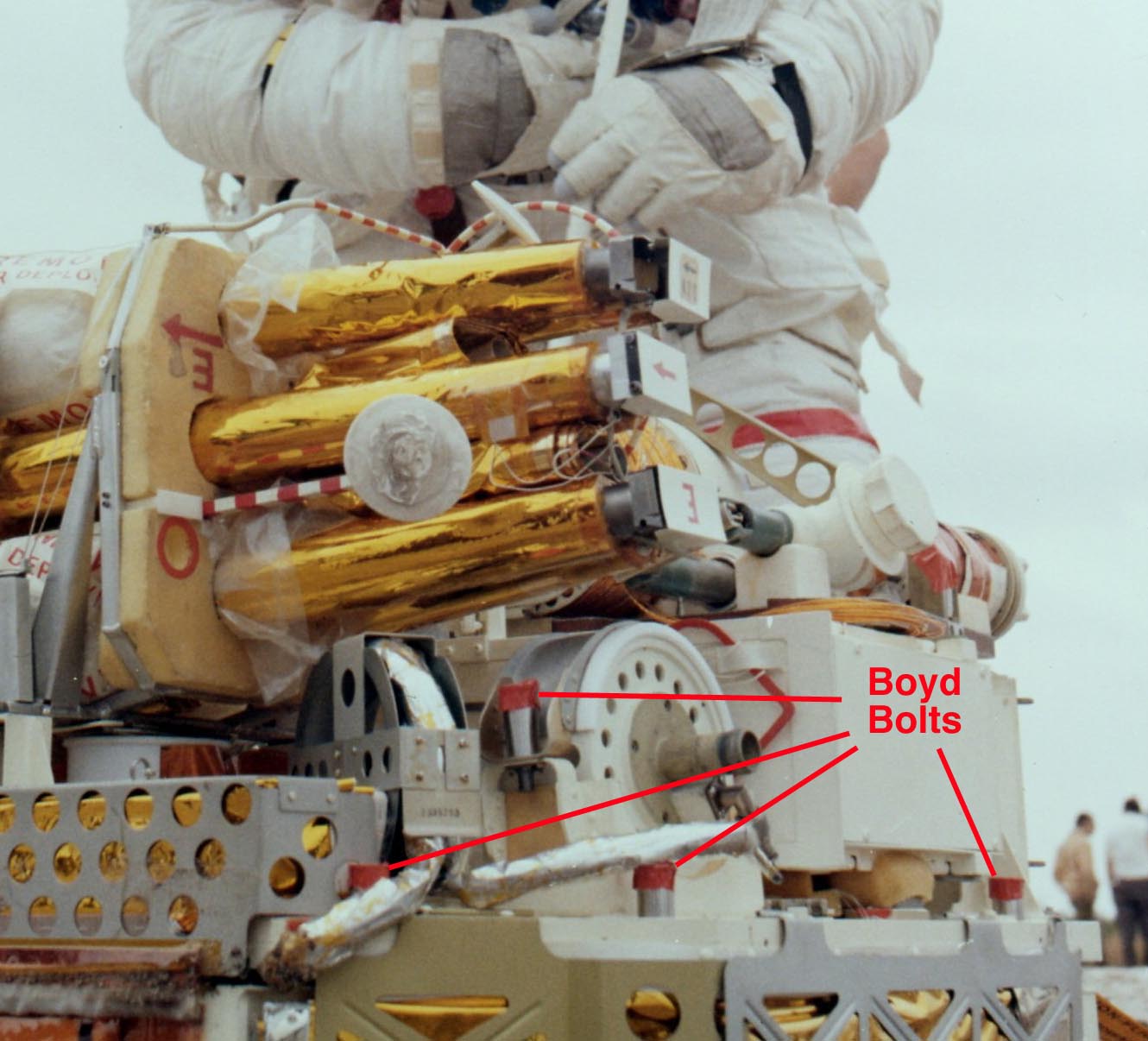 [This is Charlie's abbreviation of "Dadgummit". He is probably trying to release four Boyd bolts that secure the probe package to the Heat Flow Electronics package as per Item 2 on LMP-13.]120:57:47 Young: Okay, the Temp labels on the RTG package say "nothing". (Pause)[Training photo 72-HC-137 shows John at another point in the ALSEP deployment and a labeled detail indicates the locations of four of the many Boyd bolts.]