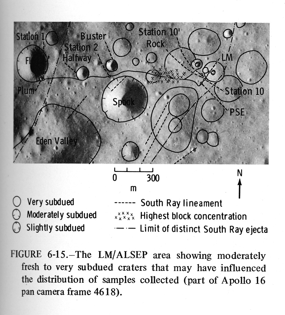 [Charlie later pointed out that the location of the Cincos can also be seen in AS16-113- 18339, the first of the photos he took of John jumping at the flag. In that picture, the tips of the fingers of John's left hand delineate the upslope rim of the largest of the Cincos, Cinco A. They will do Station 4 just to the right of Cinco A.]