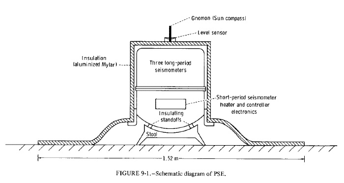 [Off-camera, John is completing the steps under "Deploy PSE" on CDR-19. In his next transmission, he will "Report sun compass align". Figure 9-1 from the Apollo 16 Preliminary Science Report is a sketch showing the alignment mechanisms on the top of the instrument, the stool on which it sits, and the aluminized Mylar skirt that provides thermal protection. NASA photo KSC-71P-578 shows John spreading the thermal skirt around the flight instrument on 30 November 1971 during a final check before stowage. AS16-113- 18360 shows the deployed PSE with the LM in the background and 18347 is a closer shot with the Central Station in the background. In 18347, the object on top that looks like a cricket wicket is the combination gnomon and handle. The level bubble is in the white cup just to the left of the gnomon. The RTG is beyond the Central Station to the left and the upright object to the right of the Central Station is an anchoring post for the thumper-geophone line which runs west from the anchor. The cable running past the RTG is the LSM cable and the cable going off to the south is the Heat Flow cable which, by the time this picture was taken, had already been broken.]121:16:11 Young: Okay, it's level; but the Sun (compass) reading is 064-1/2. Is that okay, Houston?[In Houston, EVA notes to Flight that they "sure don't know what the Commander's doing." As so often happens in such circumstances, the next transmission is from John.]