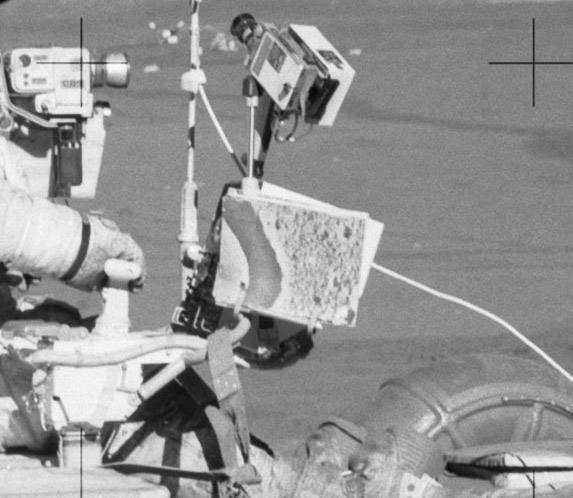 [Charlie grabs the MESA with his left hand and drops to his knees, illustrating the point discussed above. He has to lean forward to get the sunshield and, as he rises, he hops forward, out of the TV field-of-view, to get his feet under his center of gravity. Note the ETB swinging on the front of the MESA.]