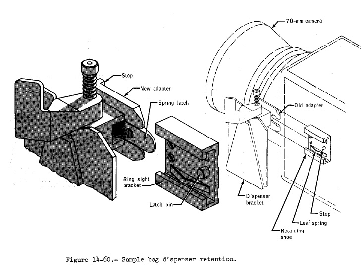 [The vacuum sealing mechanism on the rock box consists of a knife-edge on the rim of the body and a strip of soft-indium metal on the rim of the lid. When the box is closed, the knife-edge sinks into the indium strip and makes the seal. In addition to these features, there are also o-rings. To keep the knife-edge from making contact with the indium strip during the flight out from Earth, the two are kept separate by a close-fitting spacer made of hard Teflon. In addition, to keep the sealing edges clean while John and Charlie put samples in the box, they cover the rim of both the body and the lid with a piece of Beta cloth which has a cut-out to give access to the box cavity. Evidently, John has knocked the Teflon spacer off the box he is preparing on the MESA. My only doubt about this hypothesis is John's anticipation of later difficulties in closing the box. Perhaps he is worried that its loss will increase the chances of damage to the sealing mechanism. NASA photo S70-29817 is a pre-flight picture of an Apollo 14 rock box with the Teflon spacer surrounding the knife-edge. NASA photo S88-52674 shows a rock box with a beta cloth cover protecting the knife-edge and indium strip.]120:17:45 Duke: Guess what?[John takes a sample collection bag (SCB) to the Rover. He will attach it to the Hand Tool Carrier (HTC) which is on the aft pallet. NASA photos S71-22475 and S71-22477 show the tool carrier in a lab setting with two SCBs in place and AS16-107- 17446 shows the HTC on the back of the Apollo 16 Rover, albeit without an SCB. The contents of the SCB, which was stowed in the rock box, are shown in Figure 3.5-5a from the Lunar Surface Procedures volume.]