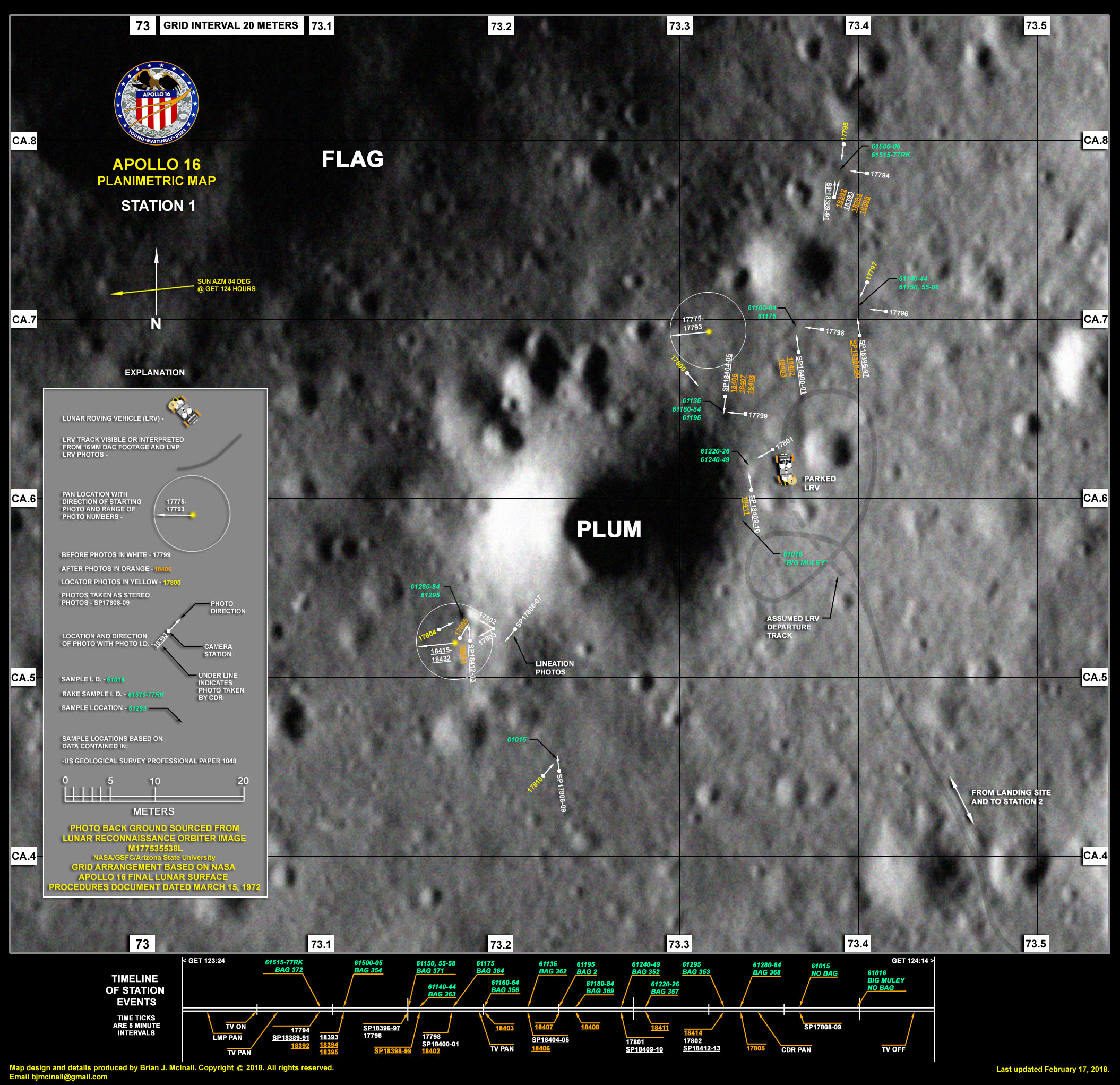 [Station 1 activities are detailed in Brian McInall's Station 1 planimetric map.]123:24:08 Duke: (To Houston) Okay, your (console) readings are (heading) 180, (bearing to the LM) 088, (distance driven) 2.0, (range to the LM) 1.4, (Rover temperatures) 115, 115, 115. Amps are zero. Volts are 68, 68, 100, 100. Rear motor (temperature)s (both) off-scale low; forward motors (both) off-scale low.