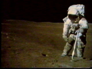 [TV on. Fendell is looking at the western horizon. Because of the down-Sun washout, it is all but impossible to tell that we are looking across to the far wall of Flag Crater. Fendell starts panning clockwise.]123:28:57 England: Our big eye is alive.