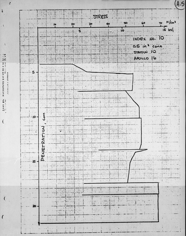[Charlie is asking Tony which of the cone-shaped tips he should use on the penetrometer. See Figure 8-1 in the Preliminary Science Report and the Station 4 discussion following 144:24:38.]149:02:27 England: Right, it will be the 0.5...Well, actually you have the 0.2 on there. Why don't you do the string of 0.2 (as shown in LMP-19) and then we'll come back and get the 0.5 near the double core.