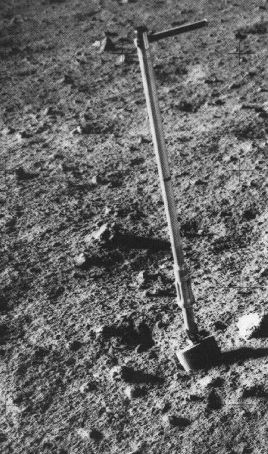 [Charlie crosses the field-of-view from left to right. He is going to get the penetrometer, which is mounted on the back of the Rover.]149:02:20 Duke: Okay, Tony, which...You want me to start with the 0.5?[The "top of the bottom one" is the top end closure of the bottom core tube as shown at the left in Figure 15 in Judy Allton's Tool Book. Had this lower section been used by itself, Charlie would have left the top end closure on the tube so he could fit it into the extension handle.]