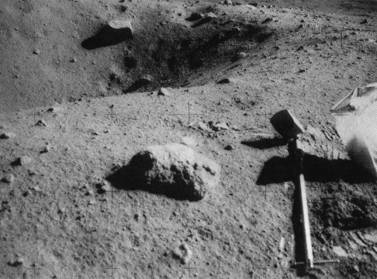 [Charlie plants the scoop, transfers the rock to his left hand, and shakes his right hand vigorously to get the dust off.]124:40:36 England: Okay. Outstanding and visor down (now that the LPM readings are done).