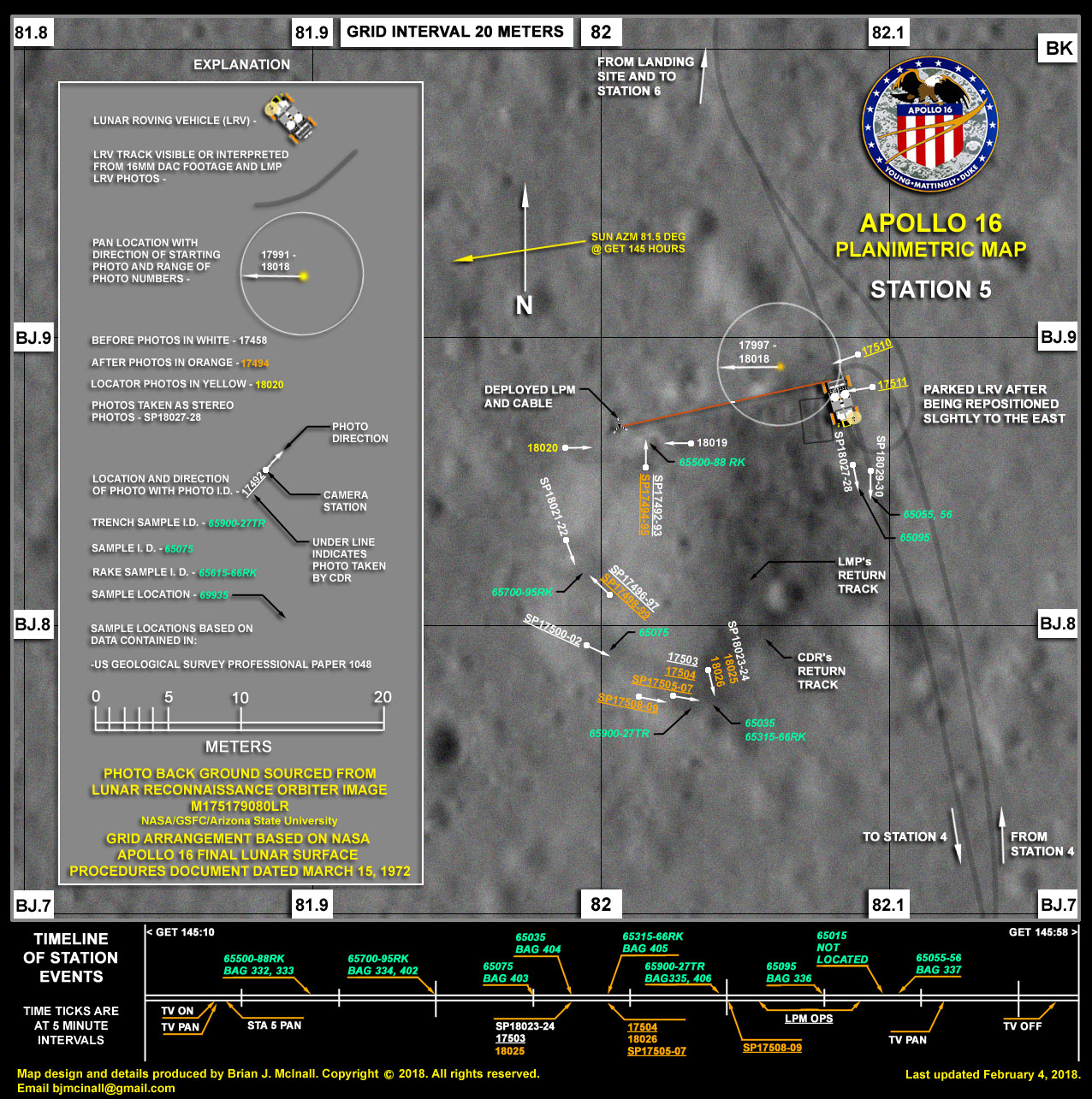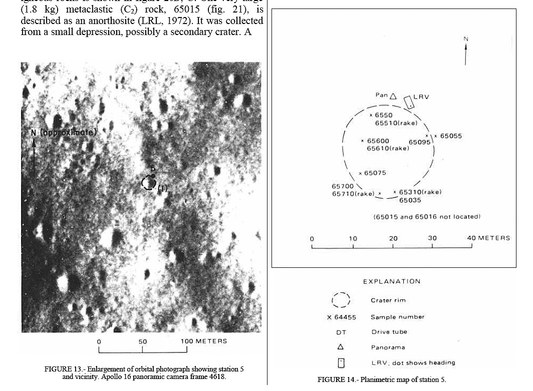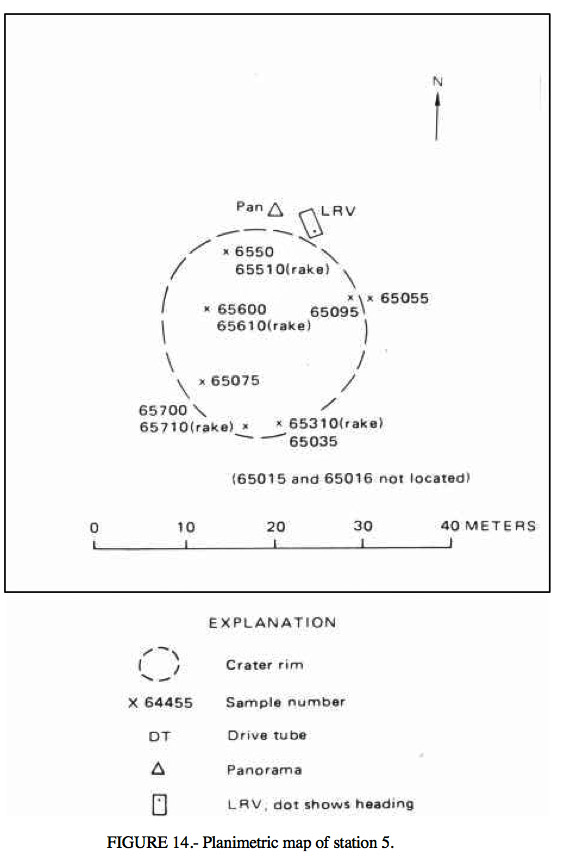 [Figures 13 and 44 from chapter D4 from the USGS Apollo 16 Professional Paper show the location of the Station relative to local craters (fig. 13) and a planimetric map of the Station (fig. 44).]145:10:11 Duke: The biggest blocks we see, Tony, are about 50 centimeters, or bigger. And they're in the bottom and all over the crater (with) no preferred orientation. Okay. We're parked at (heading) 174, (bearing to the LM) 353, (distance driven) 5.9, (range to the LM) 3.5, 100, 100...Okay. Excuse me, John. 65, 65, 100...(correcting himself) 90, 105; off-scale low, and off-scale low. (Pause) Wow![Brian McInall has revised and elaborated the Planimetric Map using LROC image M175179080LR and the Hasselblad images taken at Station 5. Note that the initial LRV paking place is indicated by a black rectangle. In just a moment, they will decide to pick up the Rover and move it about its own width farther east to the location indicated by the LVR icon.]
