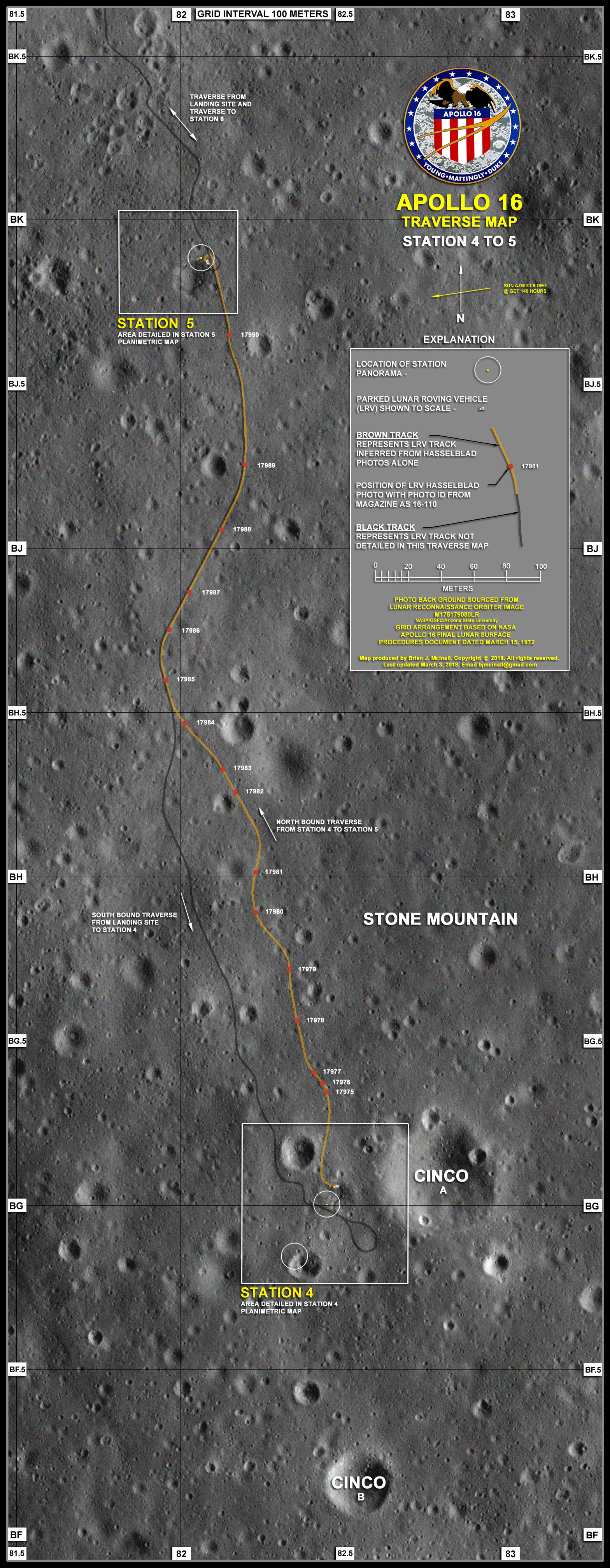 [Post-mission analysis shows that when John and Charlie arrived at Station 4, they parked about 80 meters west of the center of Cinco A, or at about BF.9/82.5. See Figure 3 in the Stone Mountain chapter of USGS Professional Paper 1048. As is discussed below at 145:11:04, John and Charlie will now retrace their outbound path and make their next stop about 500 meters north. The actual Station 5 location is near BJ.4/82.3, which is midway between the planned locations of Stations 5 and 6.]MP3 Audio Clip ( 1 min 07 sec )[Brian MacInall has produced a planimetric map of the traverse from Station 4 to Station 5. The outbound path is shown in black. They rejoin the outbound track about the halfway point, not long after Charlie takes AS16-110- 17984]