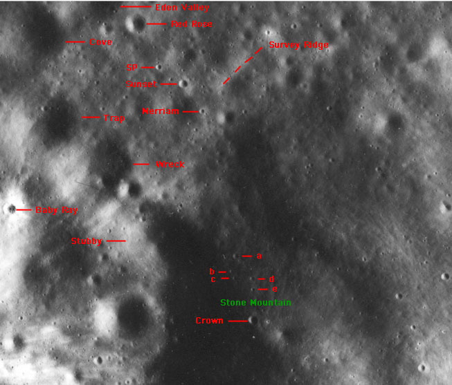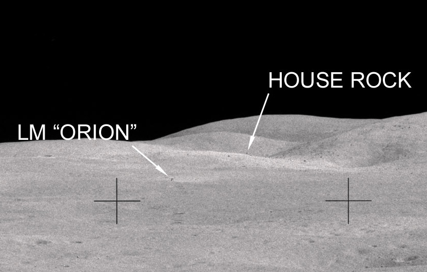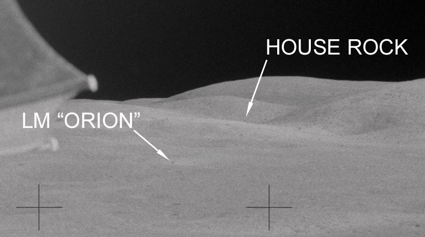 [In a detail from traverse photo 17978, Don McMillan has labelled both the LM and House Rock.]145:05:25 Young: As long as the brakes hold out...