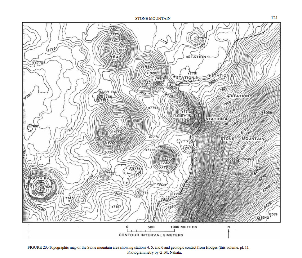 [As can be determined from Figure 23 in the Stone Mountain chapter of USGS Professional Paper 1048, John and Charlie are not going straight downhill but, even so, they drop in elevation about 100 meters over a distance of 600 meters. This corresponds to an average descent slope of 9.5 degrees. Parts of the traverse are, of course, steeper than this average. In comparison, the average downhill slope of Stone Mountain in this area is 12.3 degrees.]145:08:41 Duke: Okay, Tony. I'm keeping my eye out for a blocky rim one. (Pause)