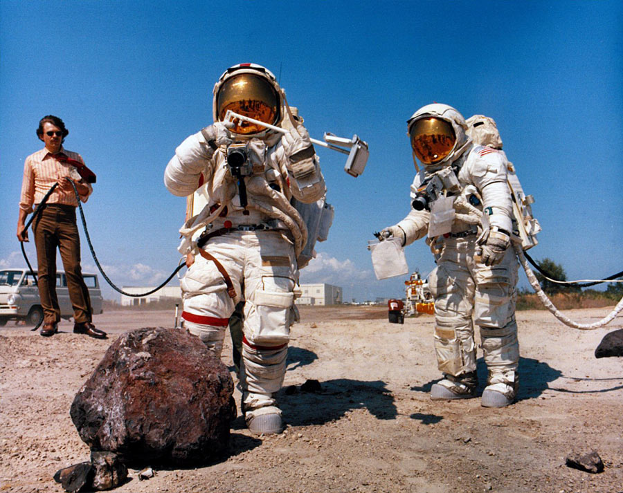 [Duke - "You could go down on a knee but, to keep your balance, you really needed like a three-point suspension - like a football lineman - so he's using a Universal Tool there to balance himself while he's working with his left hand. And I used the shovel a lot to bend down on - and the other equipment we had, like the rakes and stuff like that, too. Or, you could lean against the Rover or lean against a rock to get your sample if you had to bend over. When you leaned on something in a three-point, you could bend your knees and get down on your knees. But it was difficult to do that just by trying bending down and hold your balance because, if you tried to go down, it seemed like it was going to throw you forward. It took a lot of energy to hold yourself back when the knees were bent. The suit wanted to pitch you forward when you bent your knees."]