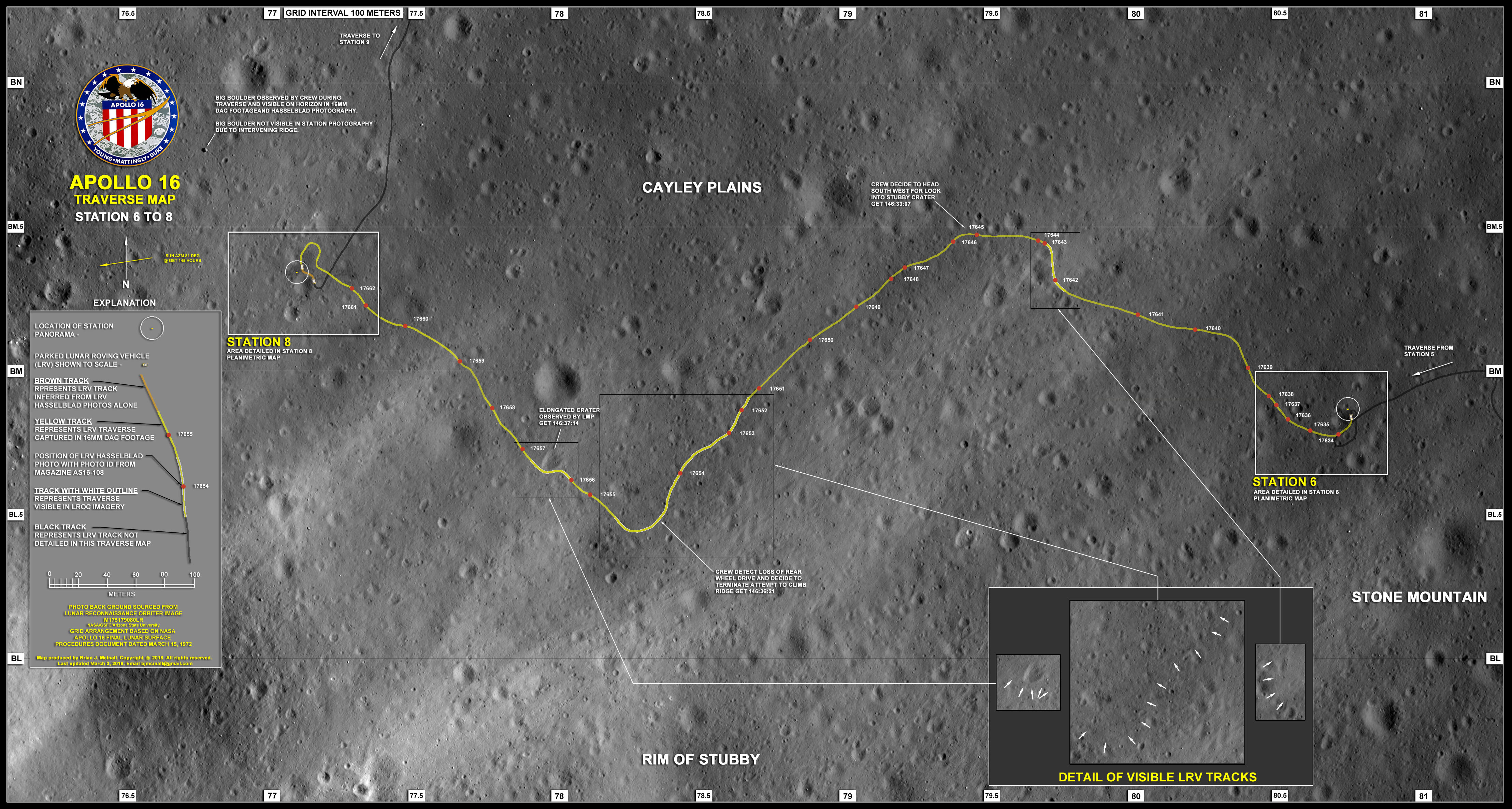 [Brian McInall has created a planimetric map for the traverse from Station 6 to Station 8.]146:29:22 Duke: And we bypass Station 7 and we go to 8. And that's...[Charlie's first seven traverse photos are AS16-108-17634 to 17640.]