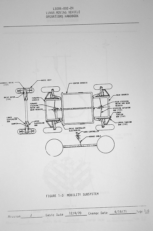 [Duke - "If I remember, the battery wires came from the front (to the instrument panel), and I think it was a little wire tray that came from the instrument panel down the center between the two seats; and then there was a little control box behind the seats. I think it was electrical and partly mechanical. I think it was covered - or the wires were shielded, anyway. I can't remember, exactly, but all we could do was look in there and see if we could see anything loose. To my recollection, there was nothing underneath the Rover that was a wire or mechanical."]146:42:03 Young: Well, it's a sort of dynamic (chuckles) situation that I don't think anybody was thinking about much. (Pause)[Although I was unable to locate any relevant information in the Lunar Roving Vehicle Operations Handbook, Charlie's recollection is suggestive of the "Rear Steering Motor and Gear Reducer" shown in Figure 1-3. And, of course, there was a similar mechanism at the front of the vehicle. Clearly, there has to have been a distribution system to get power and signals from the batteries, through the console and handcontroller to the steering motors and the wheel motors. Although it seems unlikely that any Rover components would have been sufficiently exposed on the undercarriage to suffer direct, mechanical damage from striking a rock, John may be suggesting that a connection shook loose during one of the impacts.]