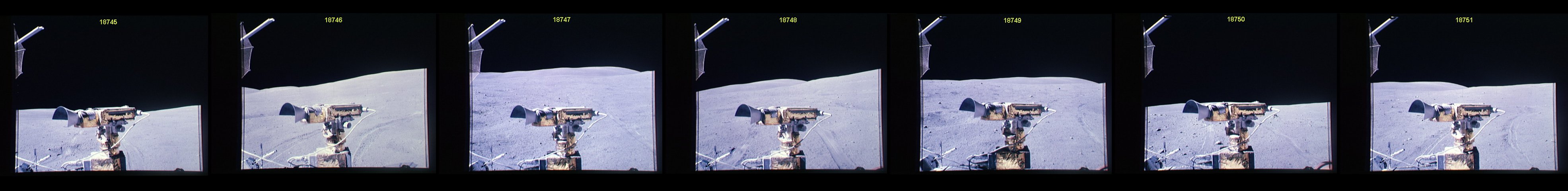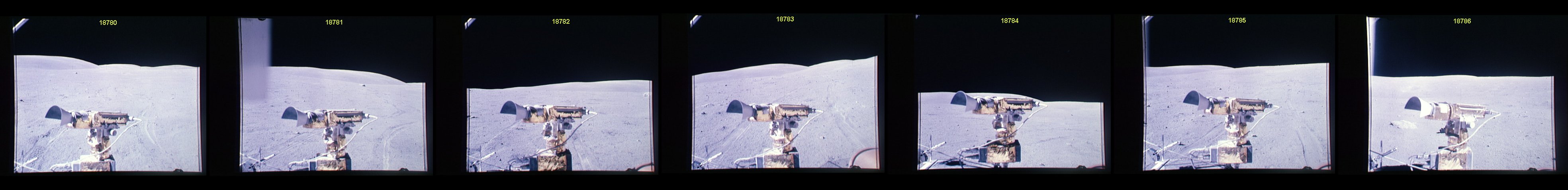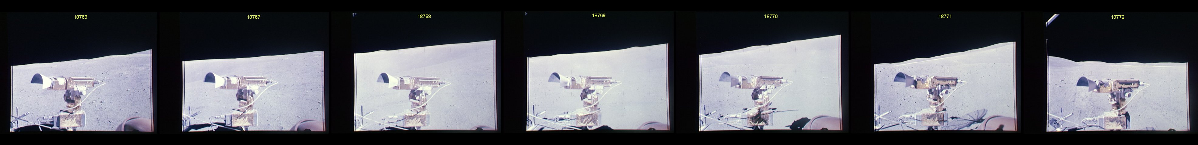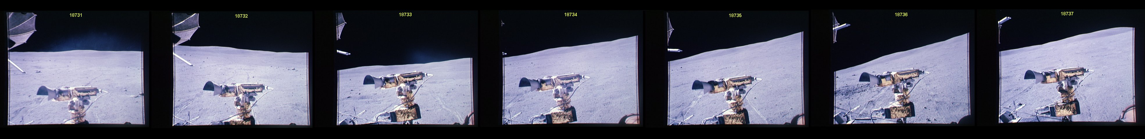 [Charlie's first seven traverse photos are AS16-117-18731 to 18737.]168:48:04 Young: Yeah. You know, so far on this trip, my personal estimation of Charlie's slope estimates that you can take them and double them. Every one of them.[Frames 18732, 18734, and 18736 are high-resolution examples. The later shows a small crater to the left of the TV camera which appears to be filled with regolith breccia ('instant rock').