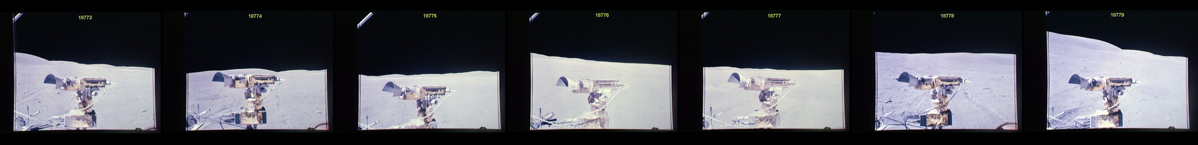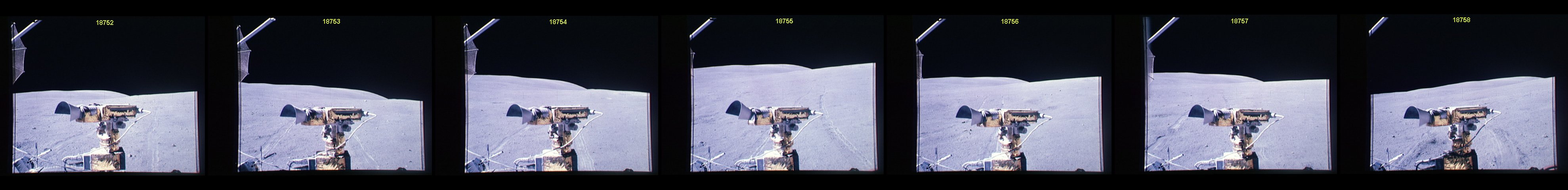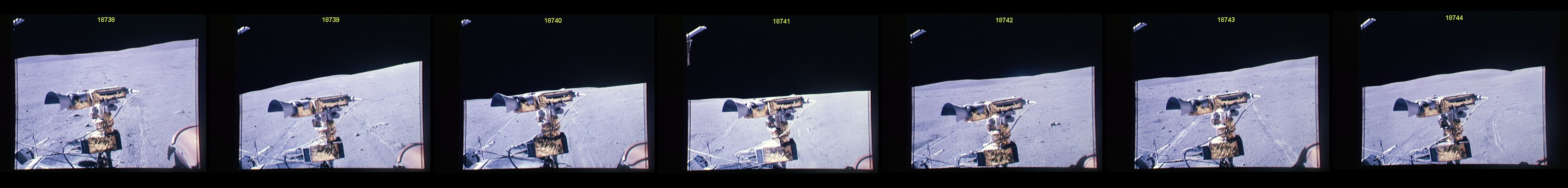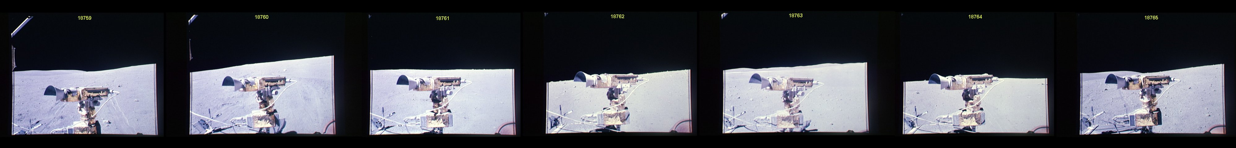[Charlie's first seven traverse photos are AS16-117-18731 to 18737.]168:48:04 Young: Yeah. You know, so far on this trip, my personal estimation of Charlie's slope estimates that you can take them and double them. Every one of them.[Frames 18732, 18734, and 18736 are high-resolution examples. The later shows a small crater to the left of the TV camera which appears to be filled with regolith breccia ('instant rock').