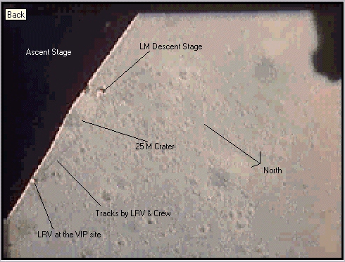 [The "gotcha lens" is, of course, the TV camera lens. Journal Contributor John Pfannerstill notes that the acronym for the Ground Controlled Television Assembly, GTCA, was commonly pronounced "gothcha". In 2000 correspondence, Tony confirms that his use of "gotcha" was probably a play on both the acronym and the crew's feeling that the TV was watching them whenever they made a mistake.]170:27:09 Young: Okay, Houston. I'm parked on a slope of about 10 degrees - or 5 or 6 or 7 degrees - (with the downslope) toward the lunar module, and it's my guess that this will help your cooling some, because it (meaning the Rover radiator)'s looking towards deep space a little. And I'm about 100 yards (90 meters) directly aft of the lunar module. Is that where you want this contraption to be? (Pause)