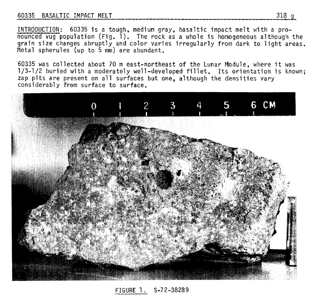 [The sample is 60330/35 which is a 318 gram piece of basaltic impact melt. It is described in detail on pages 97-105 in the Apollo 16 Sample Catalog.]170:36:27 Duke: (Static fades) Okay. I'm going to get a couple of cross-Sun stereos is all. Is that all right?