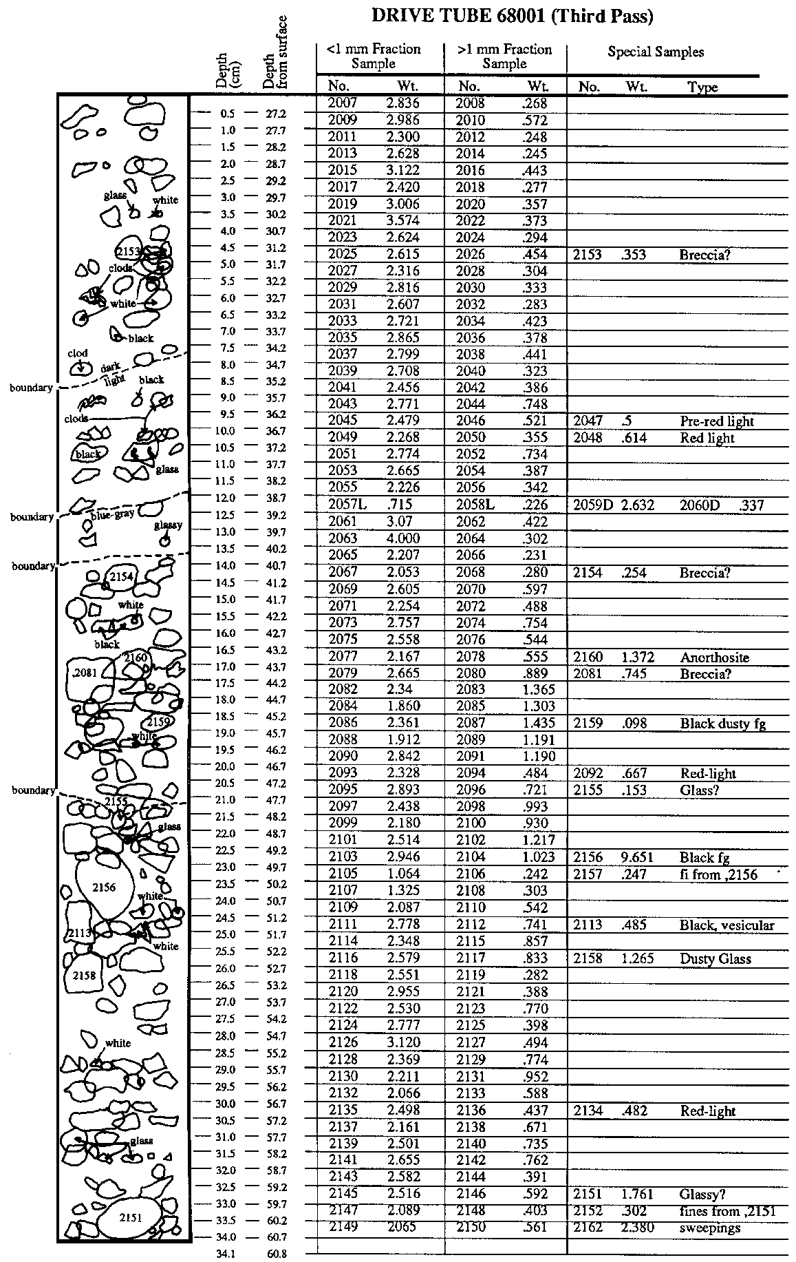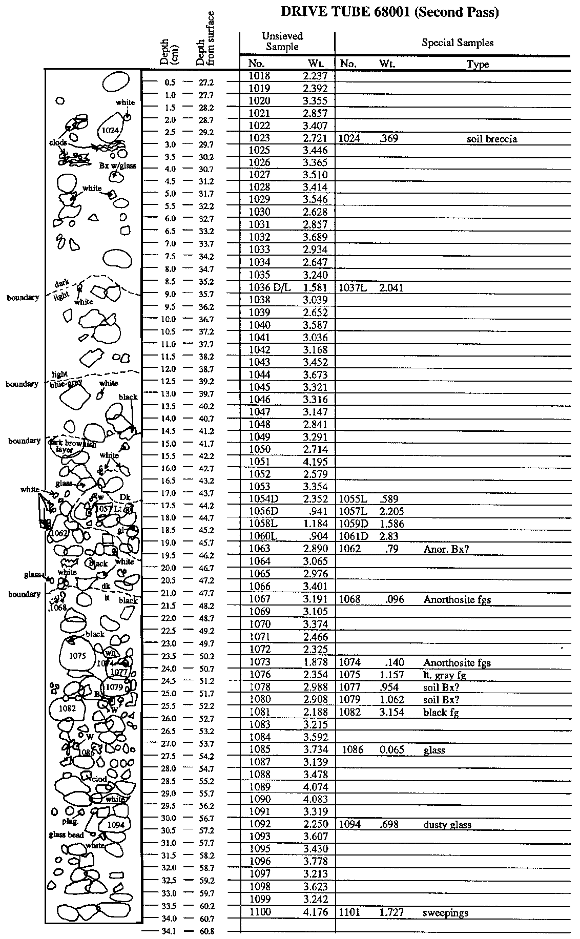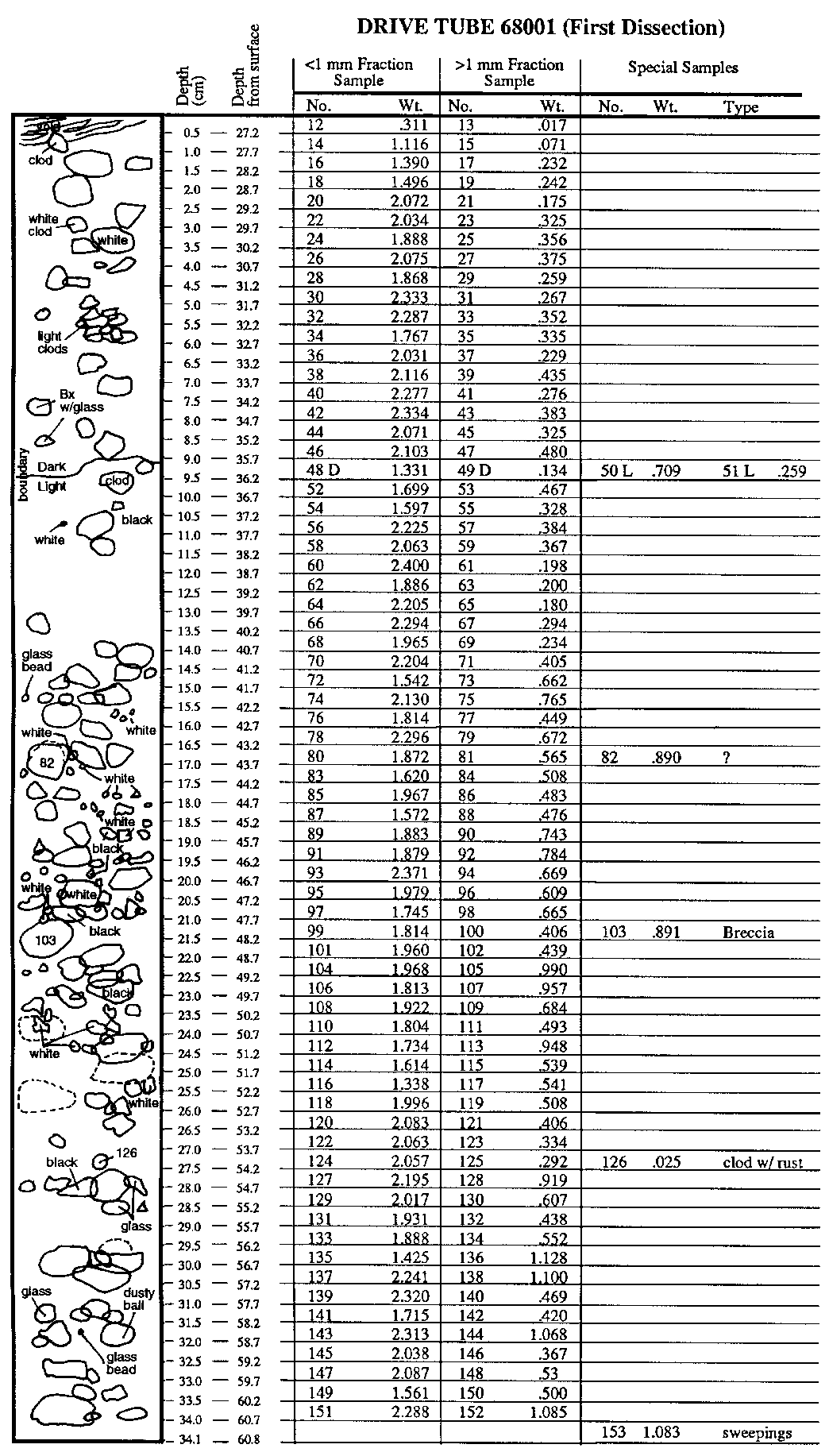 68001 was extruded on December 14, 1993. The length after extrusion was 34.1 cm; thus the total length of 68002/1 was 61 cm. The color of 68001 varied from 10YR 5/1 to 7/1 on the Munsell Color Scale and several distinct color boundaries were observed during the dissection passes. A void at the top end extended to about 1.5 cm. At 0 to about 9.0 cm was a dark layer, approximately 10YR 5/1. Dark soil breccias and soil clods were abundant and varied from small at the top to larger toward the lower end of this layer of the core. Black fine-grained glassy particles are abundant as well as some glass and anorthosites. From about 9.0 to 12.5 cm is a layer of lighter gray soil (10YR 7/1) characterized by light gray clods/soil breccias which dominate the >l-mm fraction. Anorthosites are rare and small black glassy particles are fairly numerous. At 12.5 cm and continuing to about 15 cm is a darker slightly bluish-gray layer. The >l-mm fraction consists of all coherent particles; they are generally small black glassy pieces, and breccias with a few anorthosites and glass. At about 15 cm the soil becomes a brownish-gray color (10YR 6/1) and is noticeably loose and coarse-grained. >l-mm particles are numerous and all are coherent (no friable soil breccias). A finger of light gray material extends about two thirds of the diameter of the core at about 18.0 - 18.5 cm with obvious mm-sized white fragments occurring. From about 21.5 cm and continuing to the bottom of the core is a lighter-colored zone of soil which is more coherent and whose >l-mm portion is rich in soil breccias (both clods and coherent breccias) and black glassy fine-grained fragments.