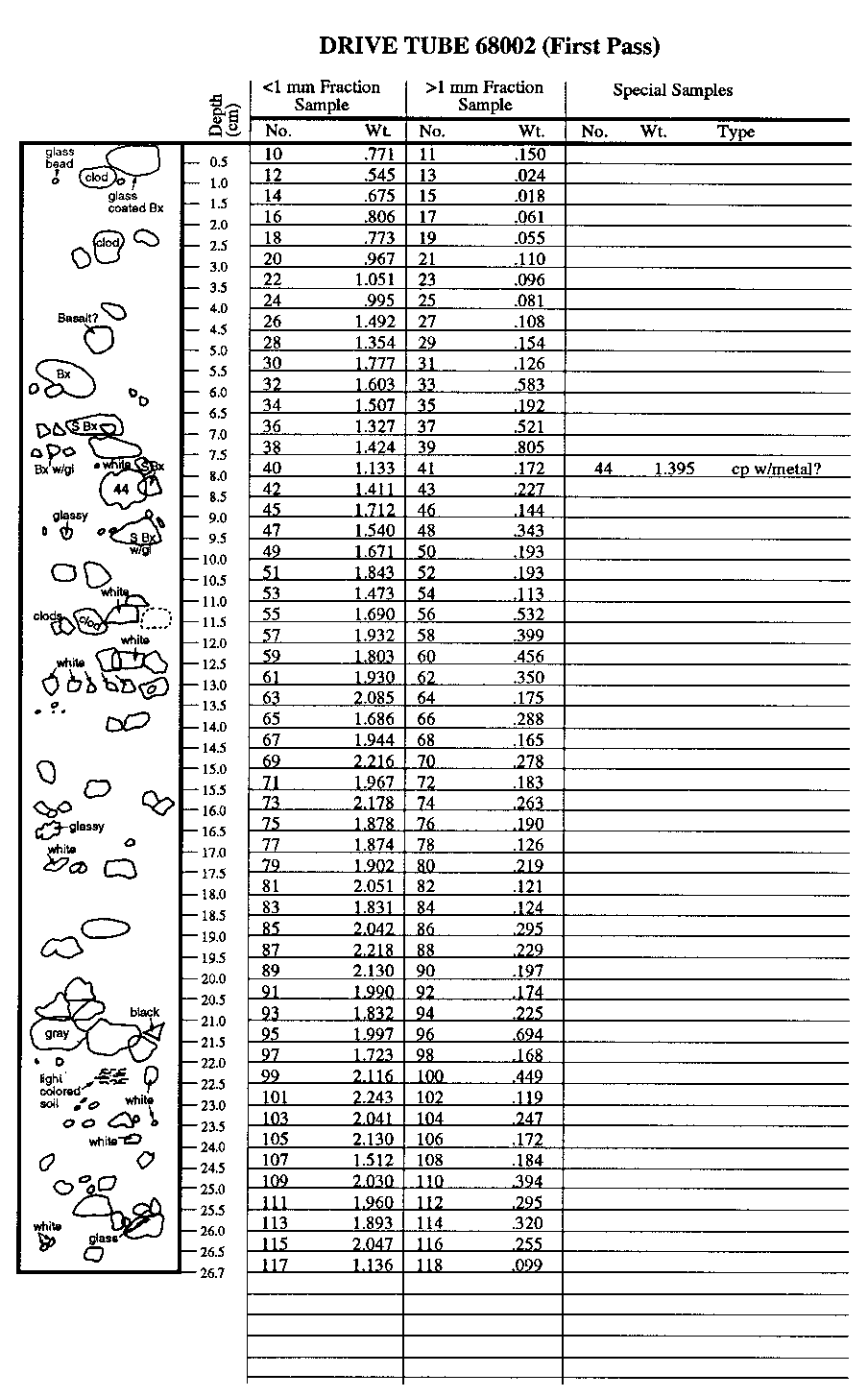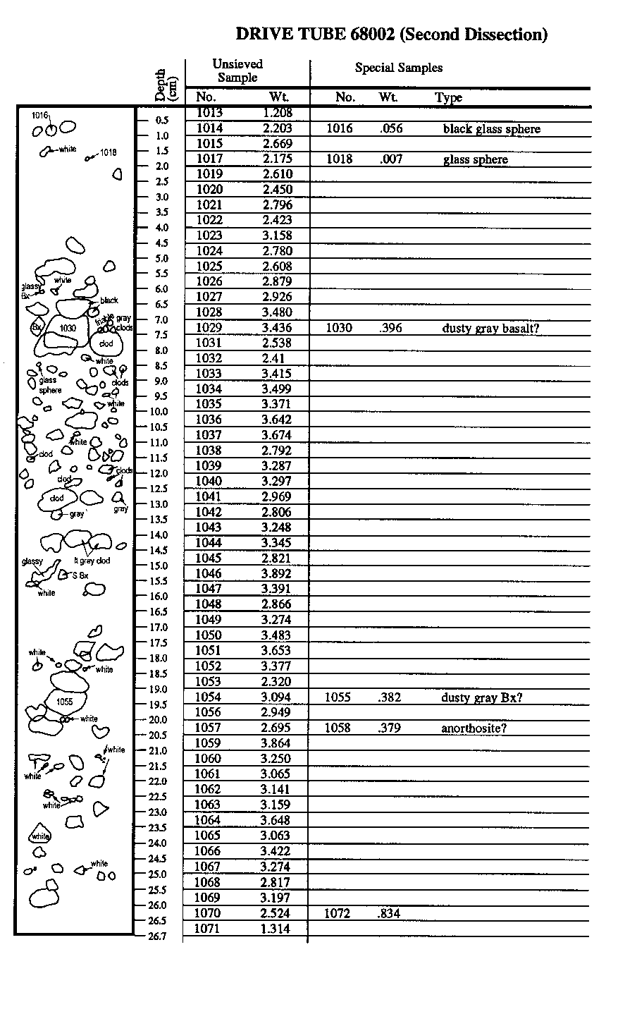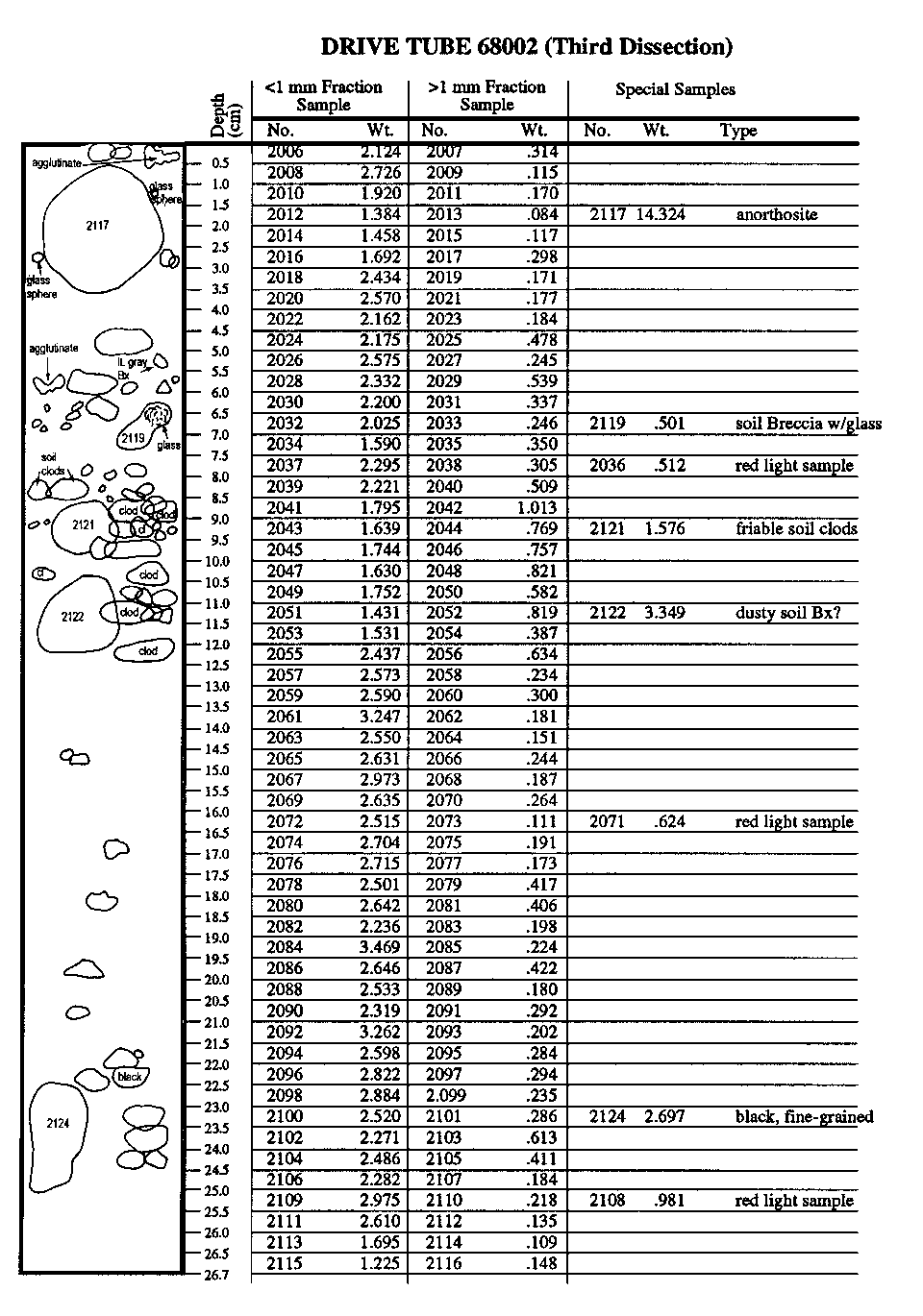68001 was extruded on December 14, 1993. The length after extrusion was 34.1 cm; thus the total length of 68002/1 was 61 cm. The color of 68001 varied from 10YR 5/1 to 7/1 on the Munsell Color Scale and several distinct color boundaries were observed during the dissection passes. A void at the top end extended to about 1.5 cm. At 0 to about 9.0 cm was a dark layer, approximately 10YR 5/1. Dark soil breccias and soil clods were abundant and varied from small at the top to larger toward the lower end of this layer of the core. Black fine-grained glassy particles are abundant as well as some glass and anorthosites. From about 9.0 to 12.5 cm is a layer of lighter gray soil (10YR 7/1) characterized by light gray clods/soil breccias which dominate the >l-mm fraction. Anorthosites are rare and small black glassy particles are fairly numerous. At 12.5 cm and continuing to about 15 cm is a darker slightly bluish-gray layer. The >l-mm fraction consists of all coherent particles; they are generally small black glassy pieces, and breccias with a few anorthosites and glass. At about 15 cm the soil becomes a brownish-gray color (10YR 6/1) and is noticeably loose and coarse-grained. >l-mm particles are numerous and all are coherent (no friable soil breccias). A finger of light gray material extends about two thirds of the diameter of the core at about 18.0 - 18.5 cm with obvious mm-sized white fragments occurring. From about 21.5 cm and continuing to the bottom of the core is a lighter-colored zone of soil which is more coherent and whose >l-mm portion is rich in soil breccias (both clods and coherent breccias) and black glassy fine-grained fragments.
