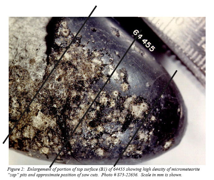 This detail from NASA Photo S73-22656, taken in the Lunar Receiving Lab after the mission shows zap pits in the 'lunar top' of sample 64455. The 'lunar top' was the surface facing the sky at the time the sample was collected. Each of the zap pits is the product of a high-speed micrometeorite impact and consists of a dark, glass-lined pit surrounded by a lighter-colored spall zone.