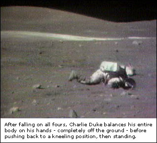 The astronauts take each other's pictures beside the flag. Ken Glover writes: The RealVideo Clip has a frame rate of 15 fps. This clip was produced from a high-resolution AVI file which I captured from the VHS source, but the RealVideo clip itself was optimized for streaming over slow (56k modem) connections and is therefore somewhat degraded in terms of resolution. For students interested in analyzing John's 'Big Navy Salute', I have made a short, 2.7 MB MPEG-1 clip of better resolution and at 29.97 fps, showing only the two jumps.
