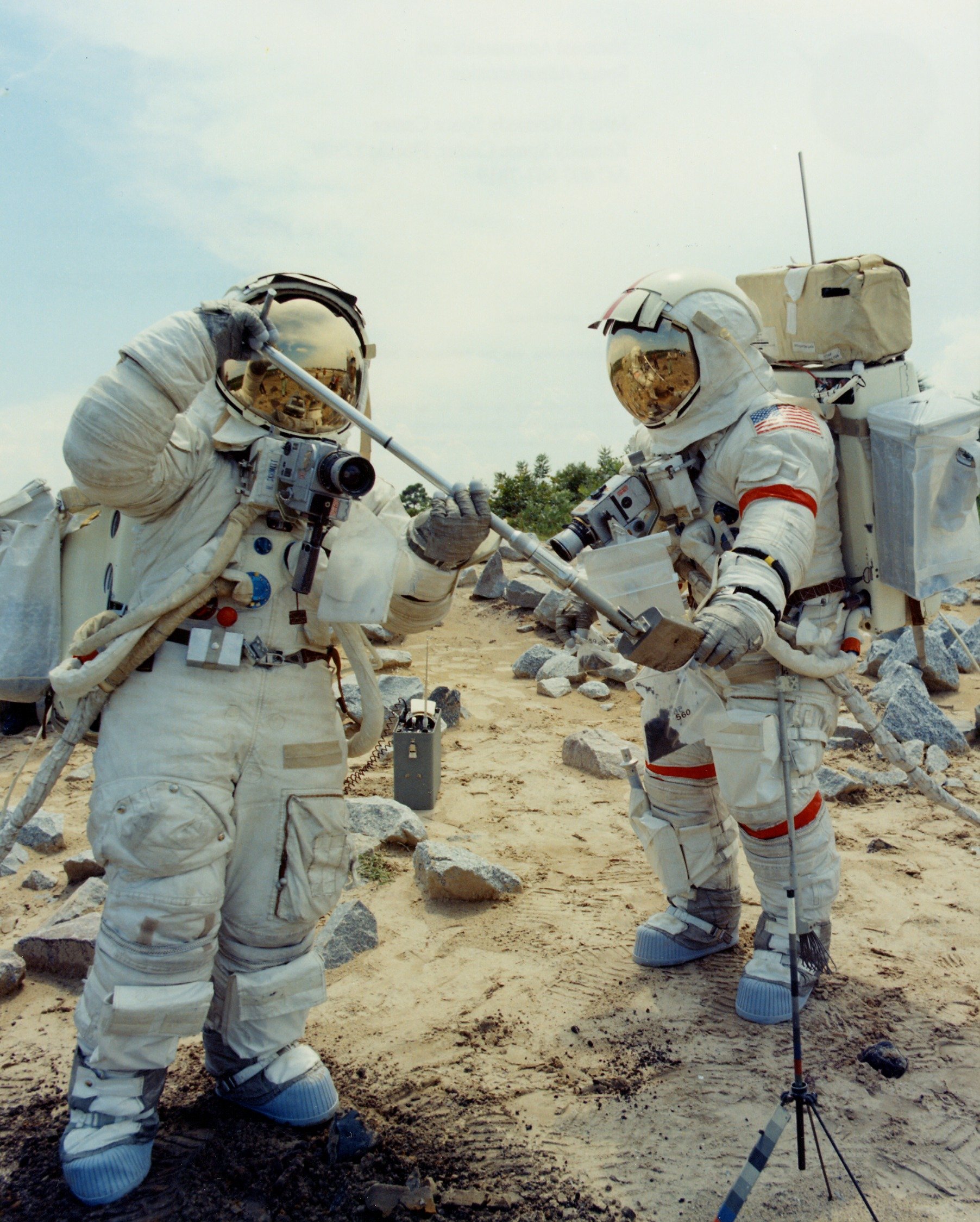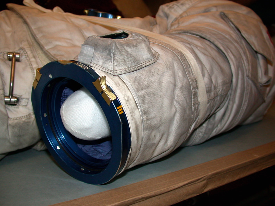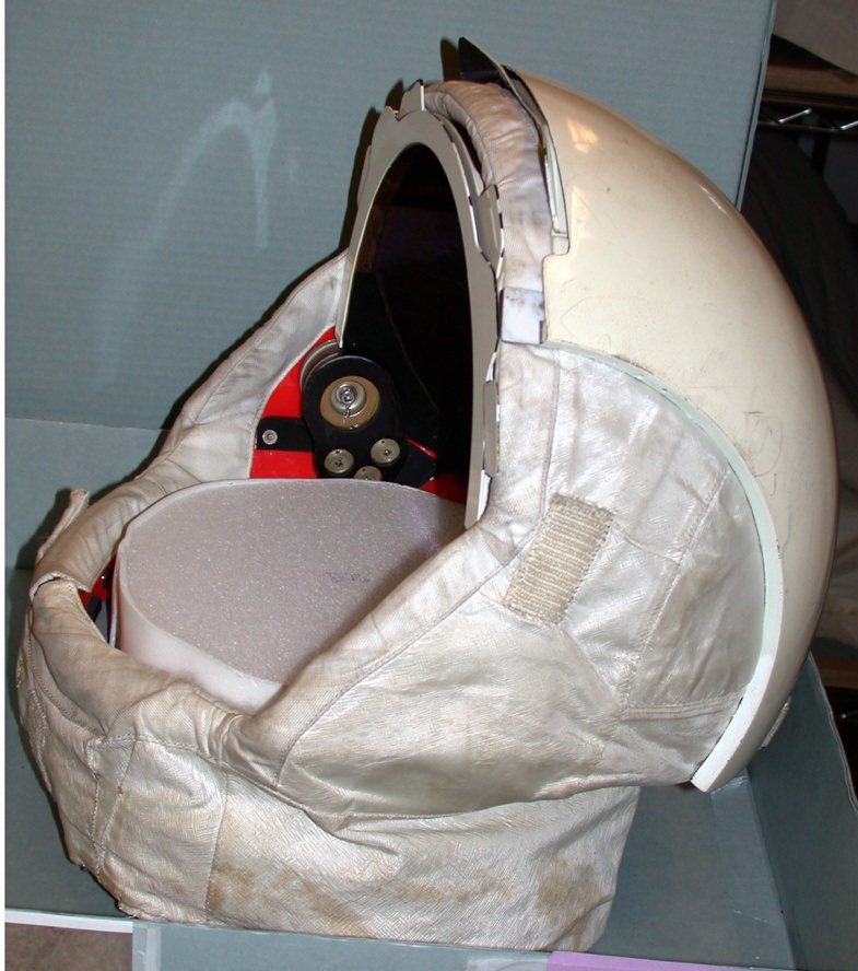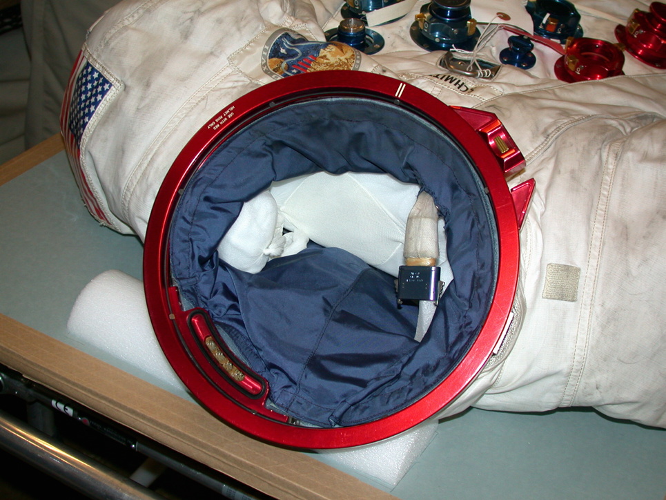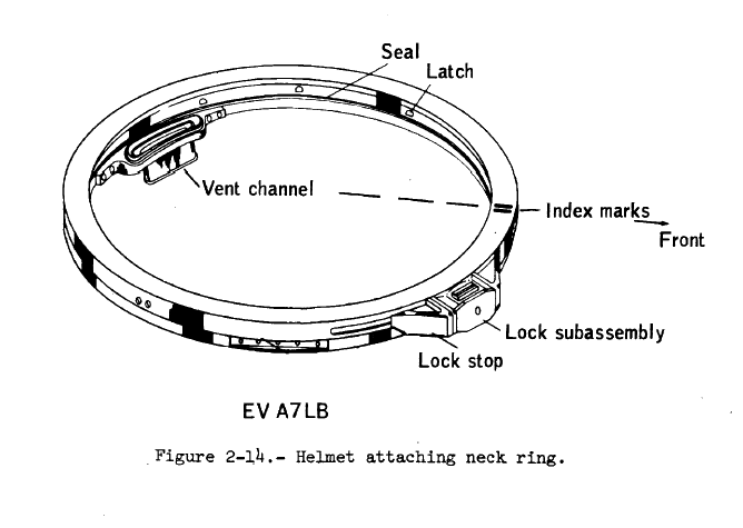 - View of the front-left. Note the multi-layer covering at the bottom, front which, after the LEVA is latched to the bottom of the pressure helmet, protects the neckring from dust and solar heating. Diagrams and a discussion can be found in an extract from the EMU Handbook.