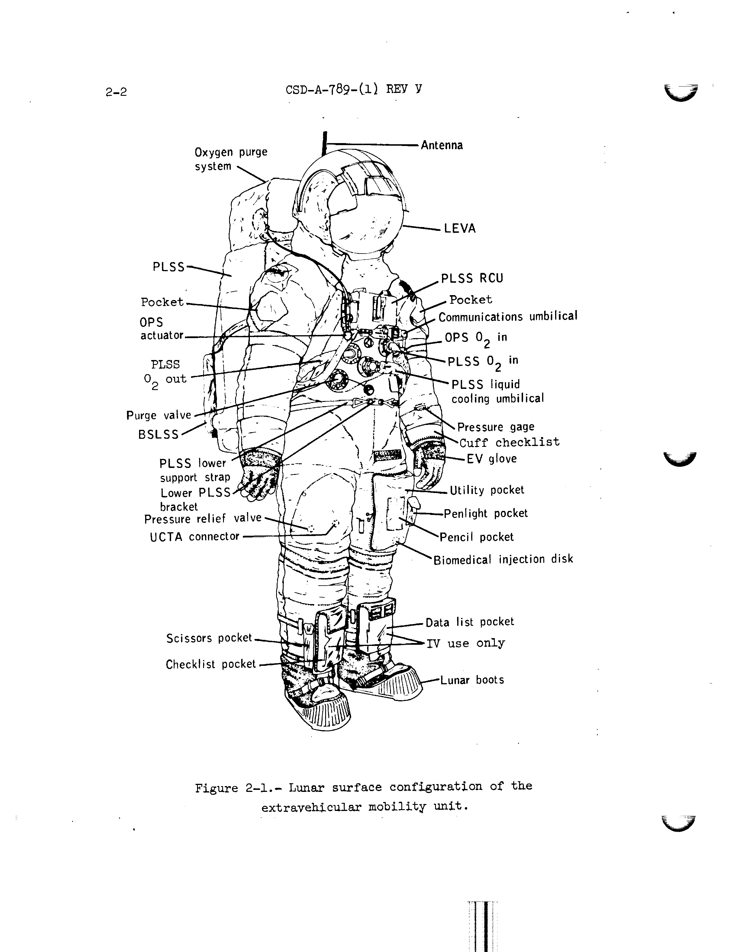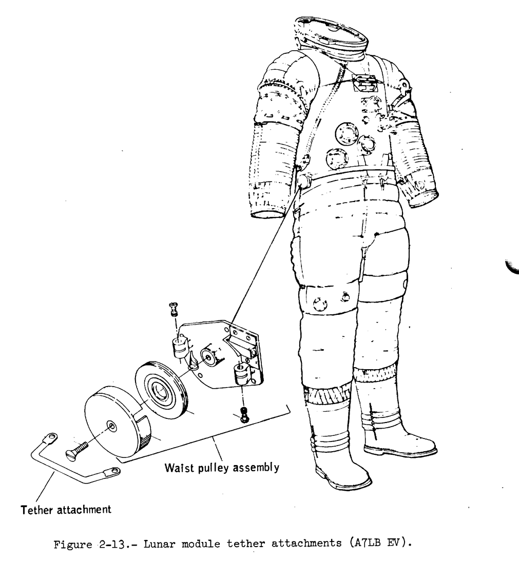 - Showing the Lower PLSS Straps fitting at the waist, the righthand LM Tether attachment on the hip, and a partly open Utility Pocket that covers most of the left thigh. See Figure 2-1 ( 150k ) from the EMU Handbook.