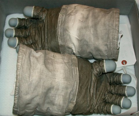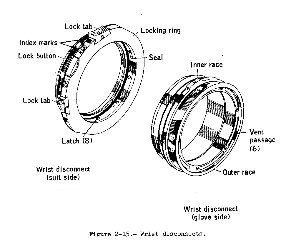 - This view is dominated by the locking ring. If 12 o'clock is up, there are lock tabs at 10:30 and 1:30. Alignment marks can be seen at 2 o'clock. In order to attach the glove, the lock button at 12 o'clock is depressed, the two lock tabs are pulled down - that is, along the arm axis away from the shoulder - and the locking ring is rotated to the right (clockwise) to the 'Open' position. As per Figure 2-15 in the EMU Handbook, the glove is inserted and seated and, with the free hand, the lock button is depressed, the lock tabs are pulled down, and the lock ring is rotated left (counterclockwise) until the lock button seats. At some point in the early 1990s, Joe Kosmo at NASA Johnson allowed me to examine one of John Young's Apollo 10 suits, then undergoing restoration. Even with bare hands, I found the wristrings difficult to operate. Dean Eppler, who works at JSC on EVA planning and suit devlepment and often wears either Shuttle or advanced-design suits in his work, writes in March 2005, "we still use the same system, although I've had far more trouble getting gloves off than on. I usually let the suit techs do it, in both instances; but about one suit run in every ten, I do it myself to convince myself if all the techs dropped dead or ran away, I could get myself out of the suit. People have asked me if there's a risk of losing a glove in space. I always tell them there's a far greater risk of getting a glove stuck on than accidently losing one."