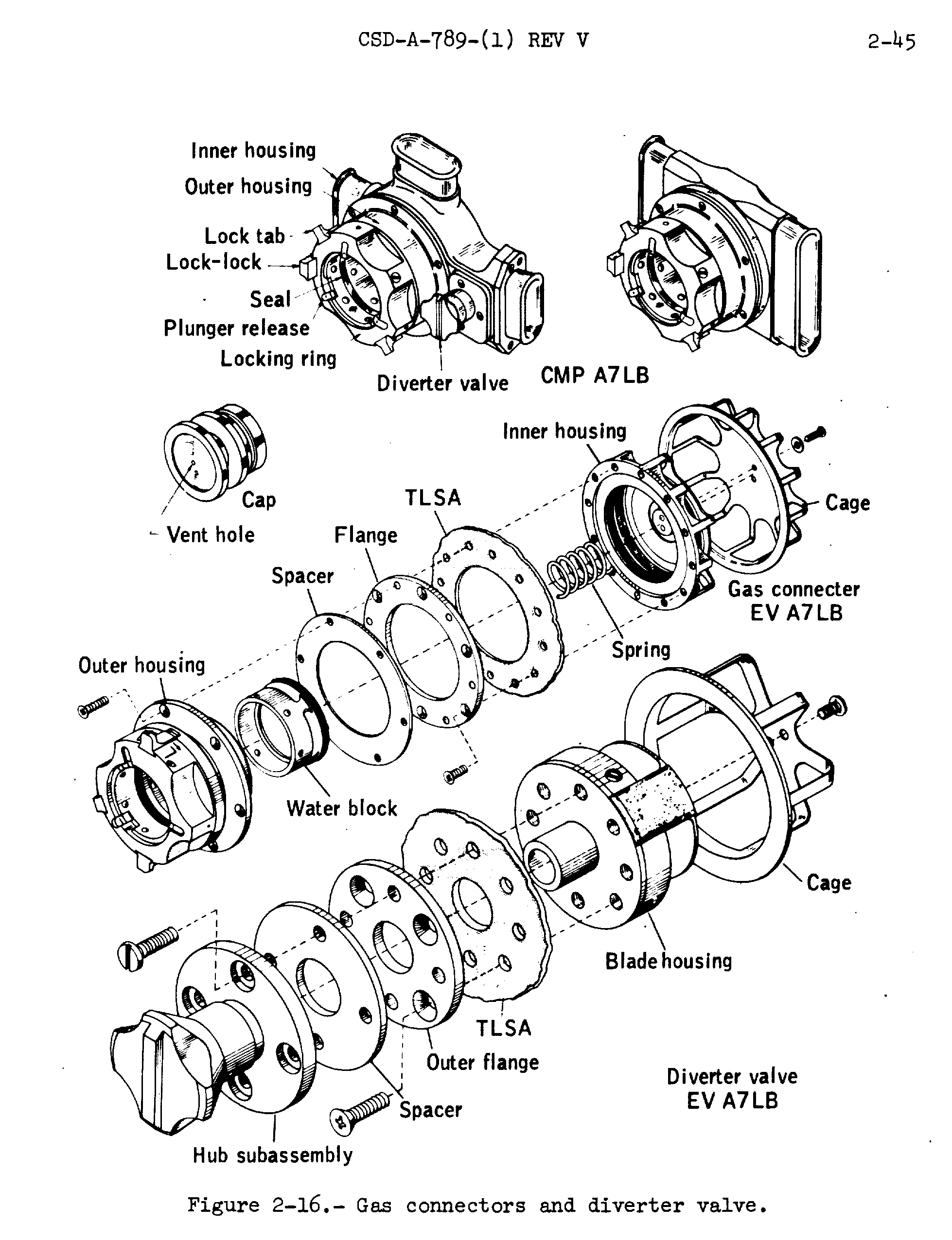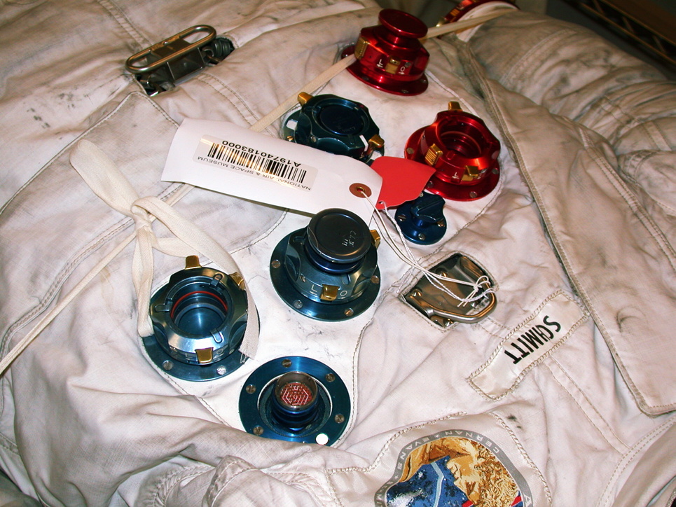 - Close-up of the chest from outside the right hip. Figure 2-16 in the EMU Handbook shows exploded views of the gas connectors and the diverter valve.