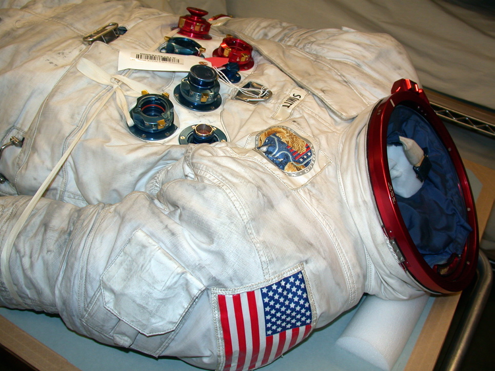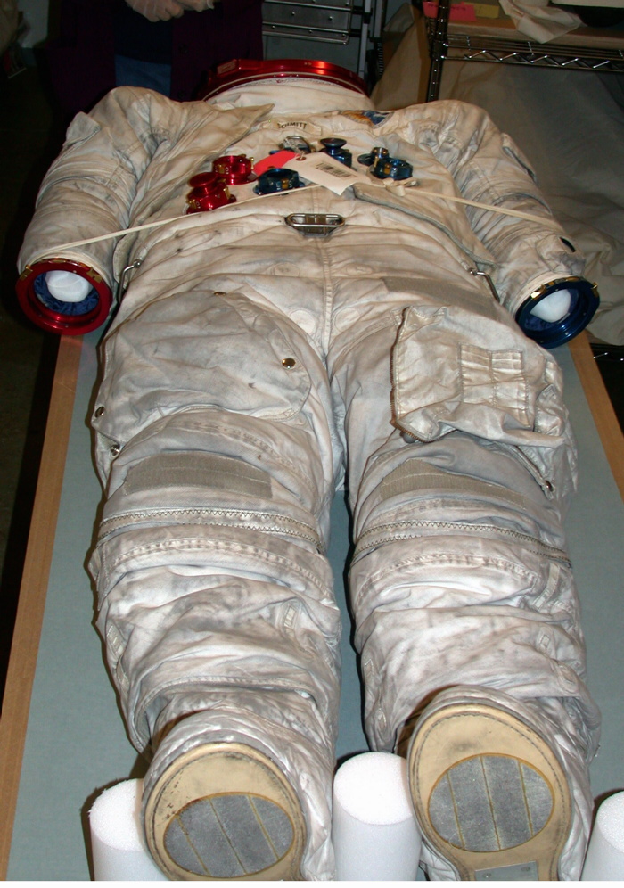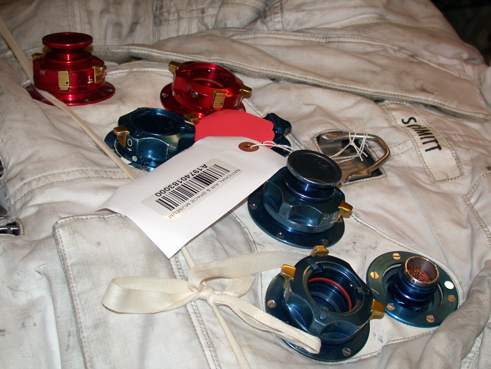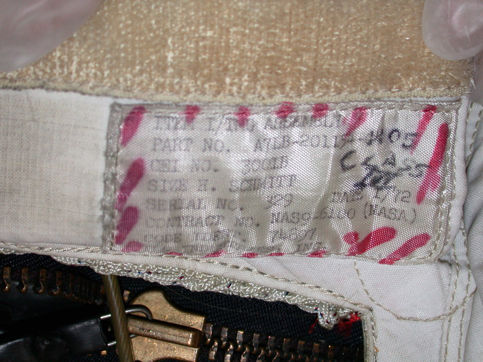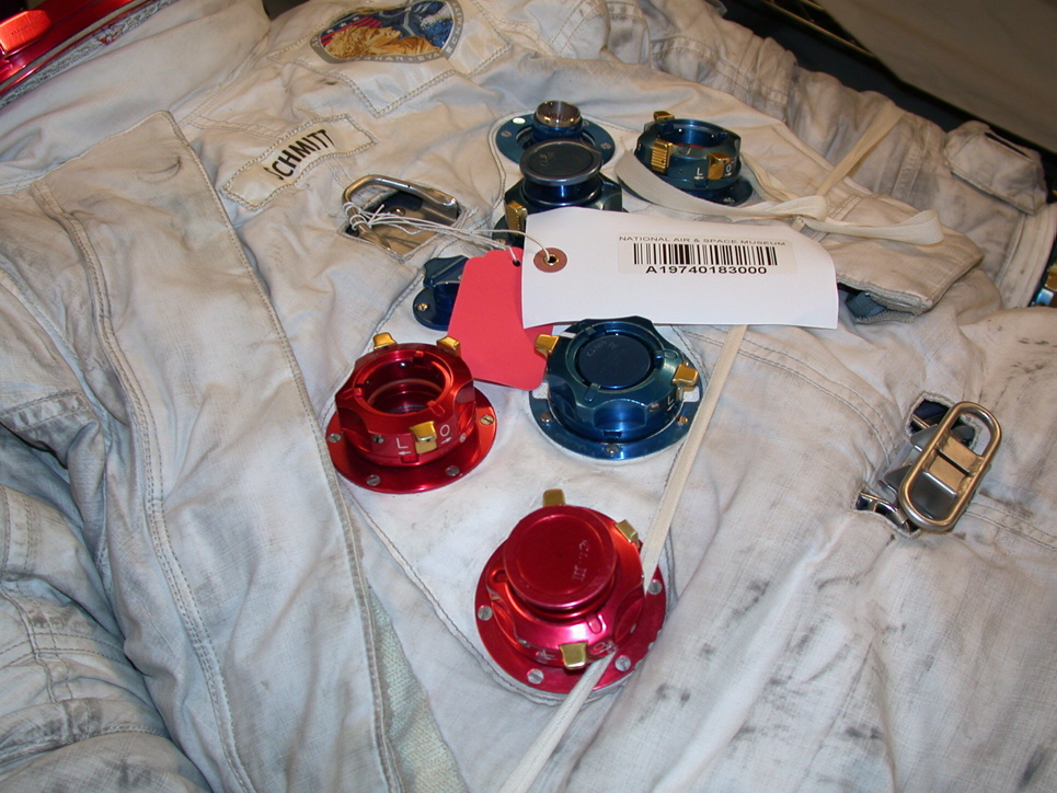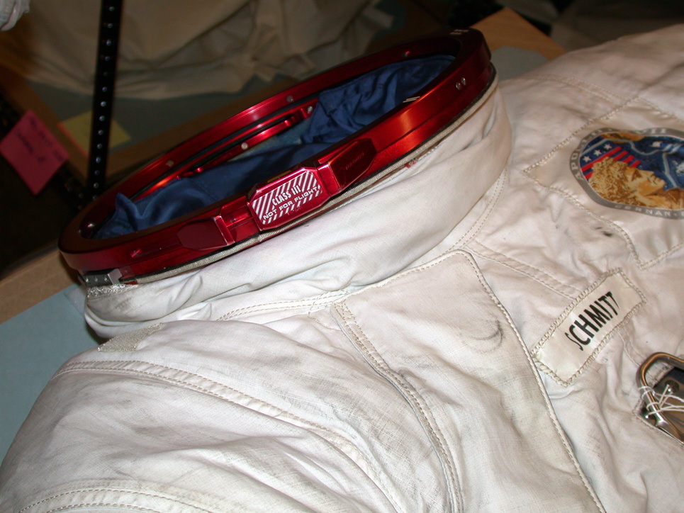 - View from above the shoulder toward the right hip. Note the pressure gauge just above the left wristring. The adjacent fitting on the left hip is a lunar module tether attachment as indicated in Figure 2-13 from the EMU Handbook. An identical fitting is on the right hip and these were used with floor-mounted tethers help keep the astronauts in place during both the descent and ascent. The RCU attachment point is just below the 'Schmitt' name tag and has a National Air and Space identification tag attached. The other fittings are identified in a labeled version of a similar photo ( 314k ).
