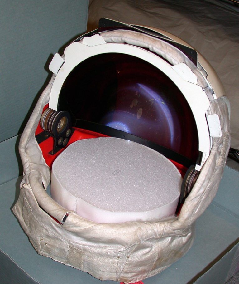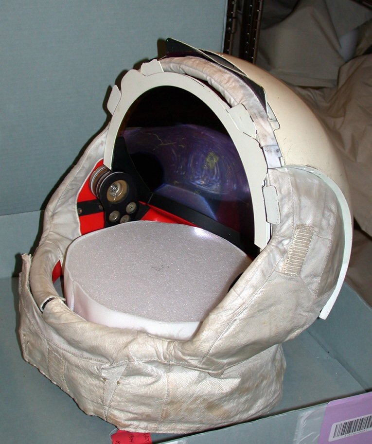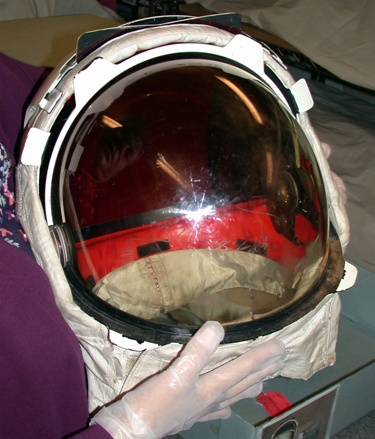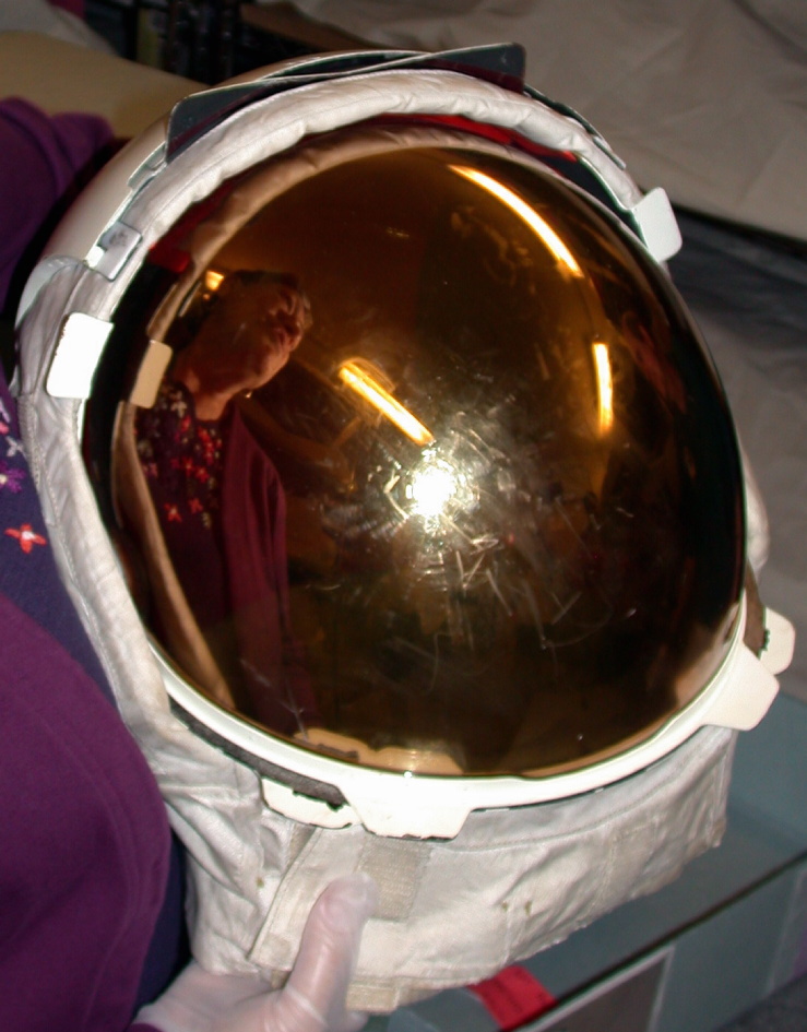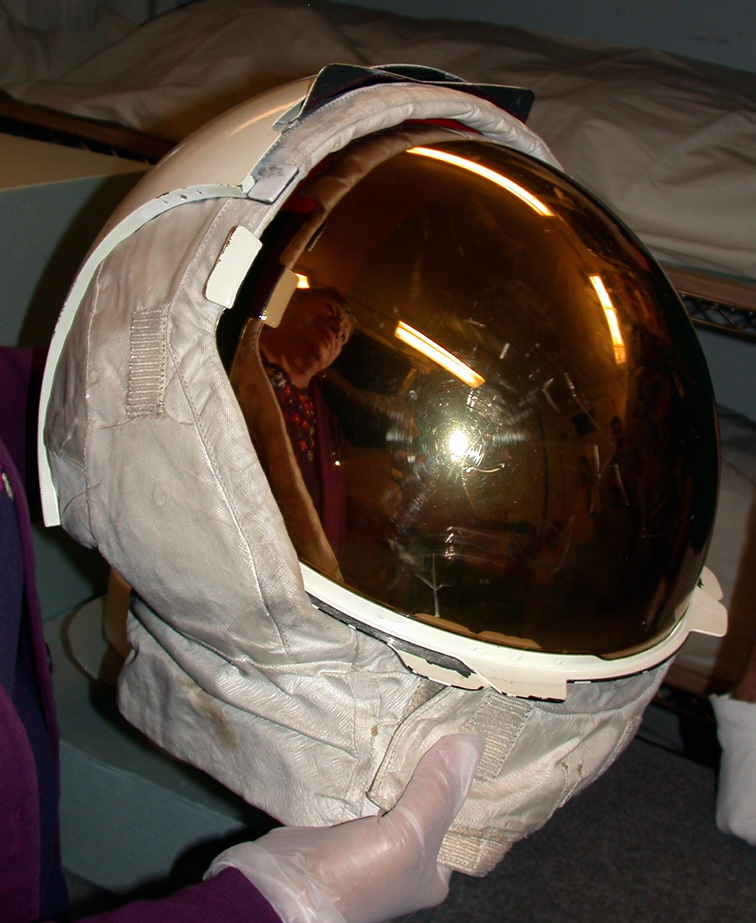 - View from the left-front with the protective visor down. Amanda Young of the National Air and Space Museum is holding the LEVA.