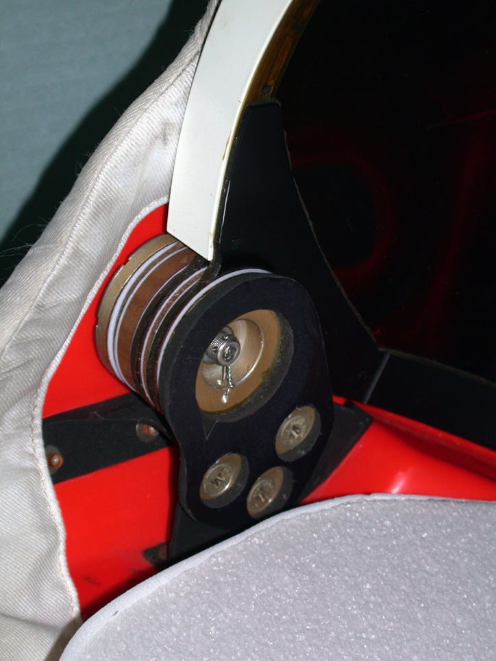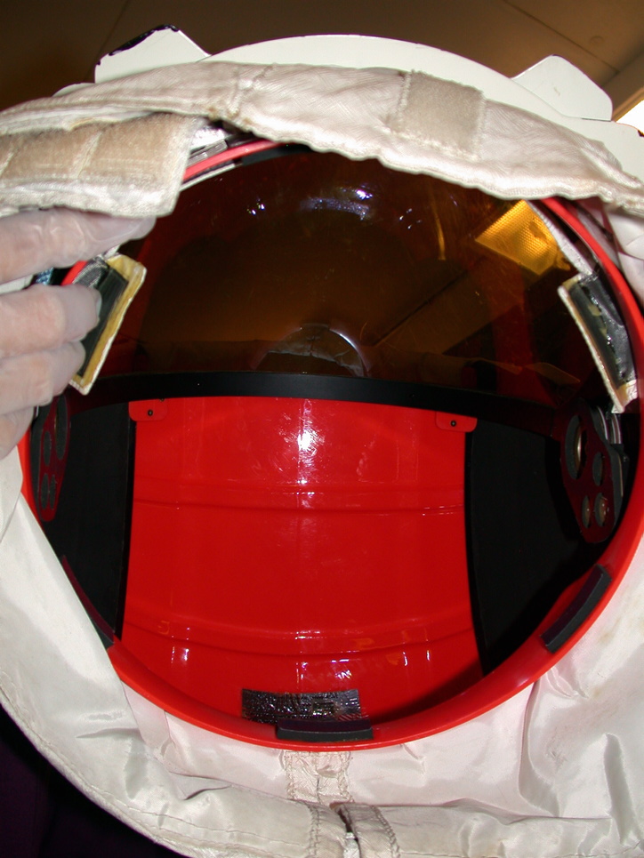 - View of the front-left showing the tabs used to pull down the visors and sunshades. The rightmost tab in the image and its counterpart on the other side are used to pull out the side sunshades. The next tab and its counterpart on the other side are used to pull down the inner, protective visor which provides both micrometeoroid and ultraviolet protection. And the two inner tabs are used to pull down the gold-electroplated sun visor which provides relief from bright sunlight and reduces heating of the inside of the helmet. At the top, a broad tab is used to pull down the upper sunshade.