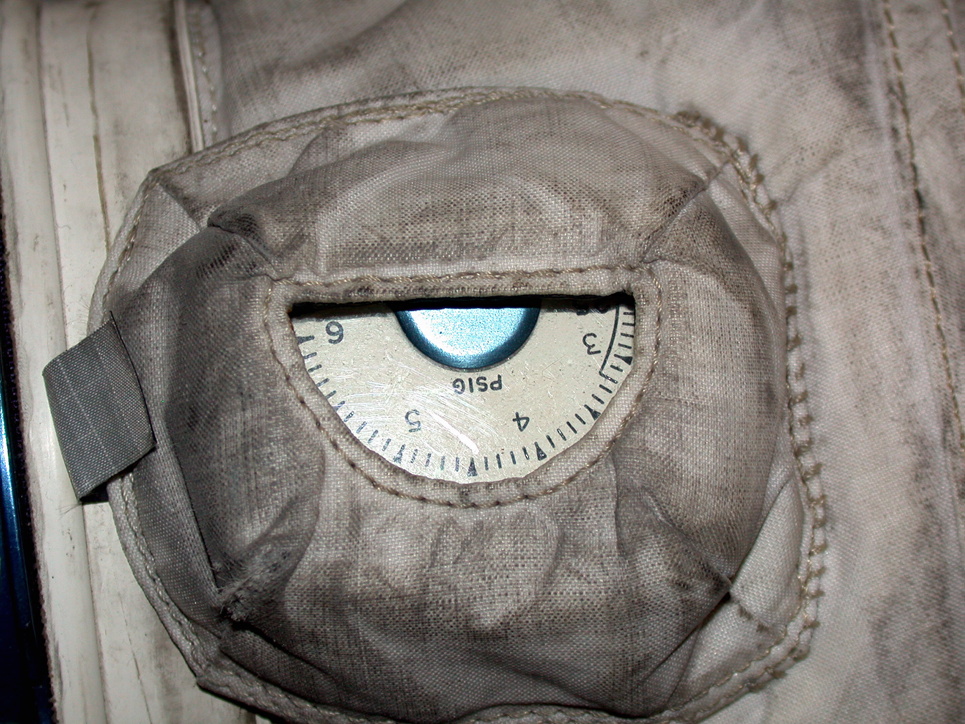 - The dial is marked from 2.5 to 6.0 psi (pounds per square inch). Note the scratches on the cover over the 5.0 position. During the EVAs, normal suit pressure was 3.8 psi. During the initial stages of cabin depressurization, as the cabin pressure decreased the relative pressure in the suit increased for a time from about 3.8 psi to about 5.3 psi because the suit pressure relief valve could not bleed oxygen fast enough to keep pace with the decreasing cabin pressure. Eventually the cabin pressure fell low enough that the relief valve could ahve a noticeable effect and suit pressure fell toward 3.8 psi.
