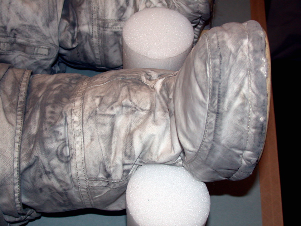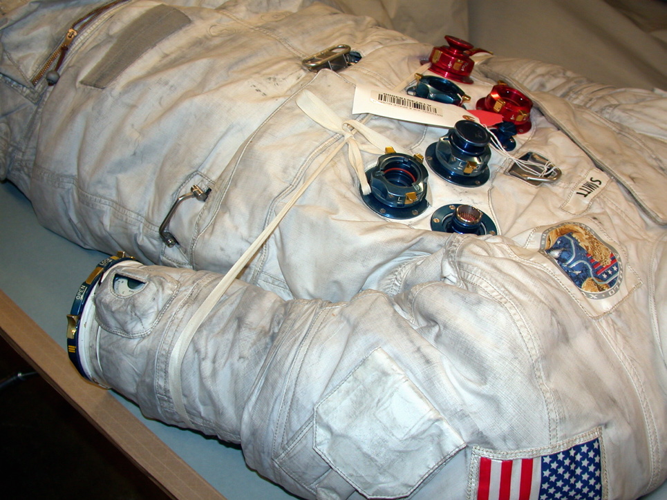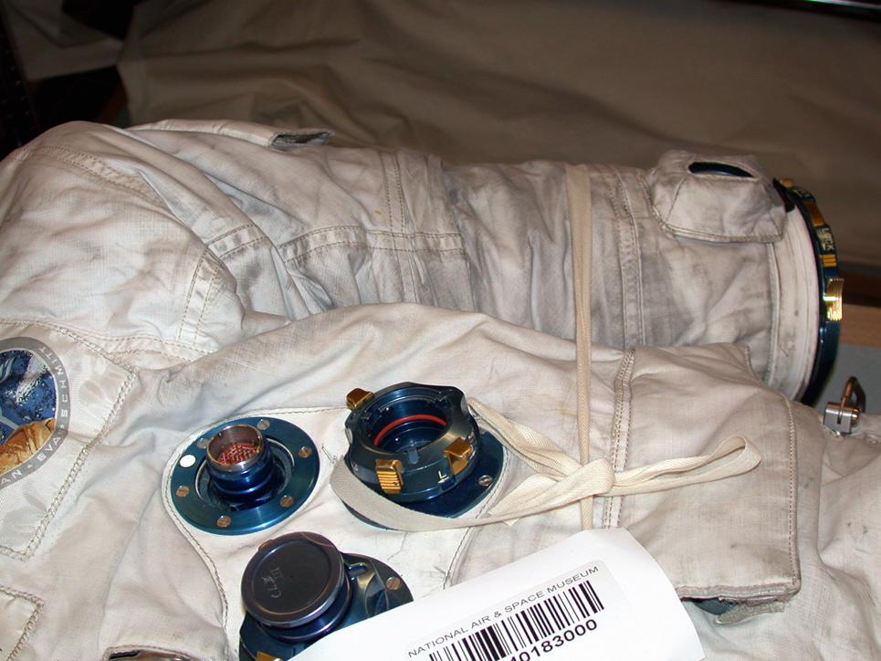 - View across the chest to the inner left arm. The comm port is at the upper left and the other two ports are for inflow of oxygen from the PLSS (nearest to the camera) and the OPS (farthest from the camera). See Figure 2-4 and related material from the EMU Handbook. See, also, Karl Dodenhoff's connector layout diagram. The cloth strap holding the suit arm close to the torso is not part of the suit.