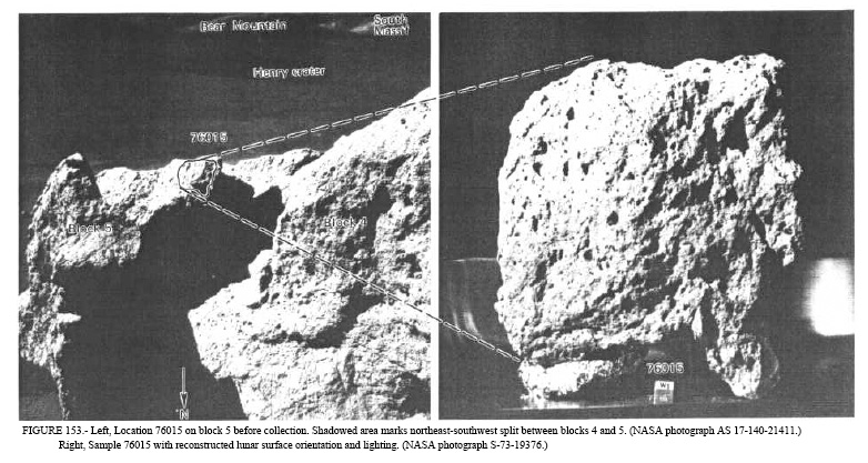 Sample 76015 was collected by Gene Cernan and Jack Schmitt at Apollo 17 Station 6. It was lifted off the top of Block 5 of Split Boulder.