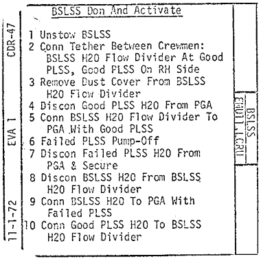[Cernan - "I don't remember much about it, except that it was a buddy-breathing system - a set of hoses and stuff - that would let us share one of the oxygen supplies if the other one failed. It would have restricted our movements, but it also would have got us back to the LM."]118:18:20 Schmitt: Okay, ETB...Okay, CDR's camera film magazine I had to work on a little bit to get it to work, but it's working.[The Buddy SLSS was actually a set of hoses which would have allowed them to share cooling water rather than oxygen. It was intended for use in the case of a failure of one of the PLSS cooling systems. As for the case of a dual failure of a PLSS and the Rover, it is an open question whether the two astronauts, connected by the BSLSS hoses, could have walked fast enough to get back to the LM from any appreciable distance. The chance of a dual failure was, however, remote enough that providing for a dual failure would have been a waste of precious weight allowance. BSLSS connection procedures can be found on checklist page CDR-47.]