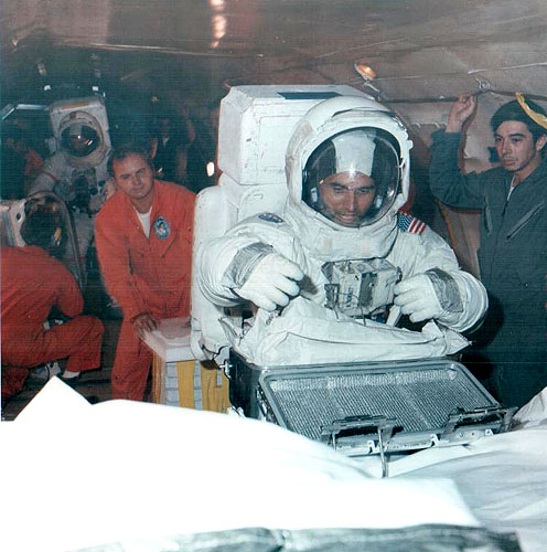 [Gene turns to look toward Jack before calling to him.]118:58:53 Cernan: Hey, leave me enough room to deploy the heat flow.