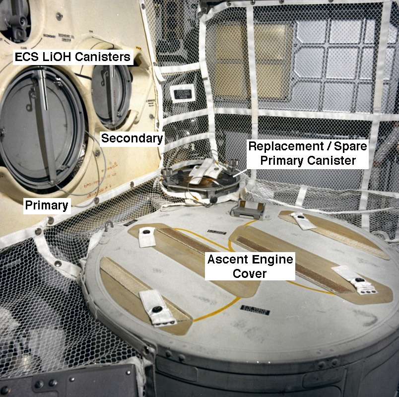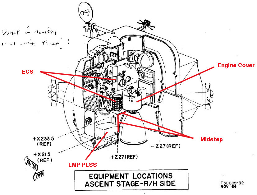 [As can be seen in the accompanying diagrams, the plus Z-27 bulkhead separates the front the cabin from the back, and is just forward of the ascent engine cover. The plus Z-27 bulkhead is also the front face of what is called the midstep.]124:07:29 Cernan: Okay.[Cernan - "By this time, I was really tired and it was a lot of trouble to get back in the cabin. It's such a small space; and you've got to twist and turn to get in there. You've got to crawl in with that big PLSS on your back until you hit the back bulkhead with your helmet. Then you've got to start arching your back so that you can get your head up so that you can get further in. But you've got to keep the PLSS clear of the DSKY, so that means really arching your back. Then you push with your feet until you're in and you can stand up and then turn around. And it didn't help that a lot of space, particularly on the engine cover, was taken up by the boxes and bags we'd brought in from the surface. It was really crowded."]