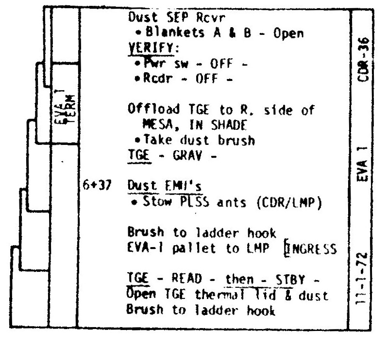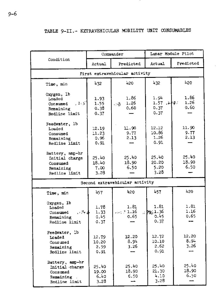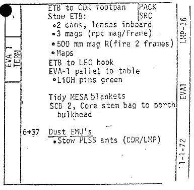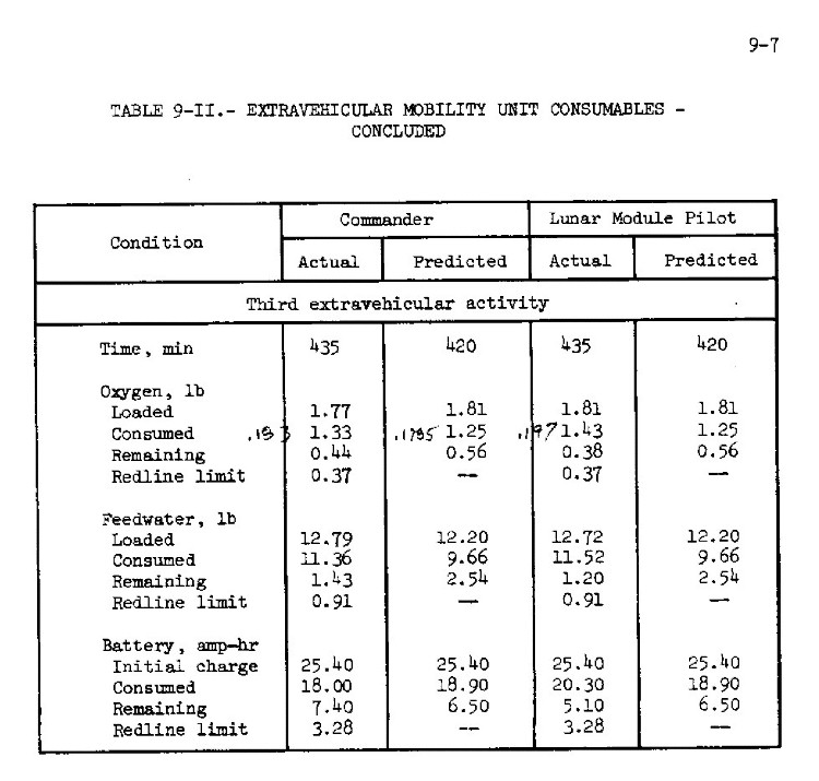 [Table 9-II gives EMU consumable status for EVAs 1, 2, and 3. Both Jack and Gene will consistently use more oxygen and cooling water than predicted pre-flight, but will end each EVA with comfortable margins.]123:23:30 Cernan: I'm going to leave this (SRC) right here (on the MESA table) until I take it up to you. Okay. (Reading CDR-35) "Close (the SRC) and verify good seal, place (SRC) in plus Z (LM footpad)." Okay, "LRV circuit breakers: LRV LCRU power, Off. Dust." Well, let me get at that dusting first.