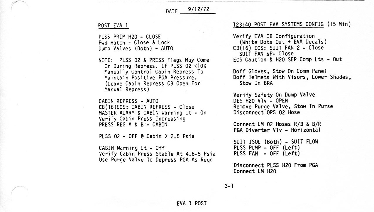 124:09:07 Cernan: (Reading from the post-EVA cue card, which has the same information as checklist page 3-1) "Primary water, Closed. Forward hatch..." Turn our Water (to) Off. (Pause) Do you have to turn the primaries or just the secondary (Auxiliary), Bob?