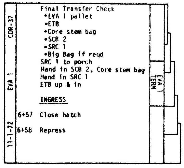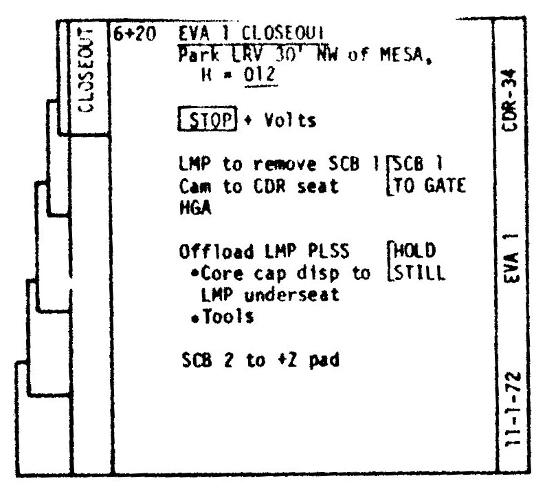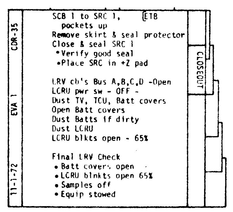 [Fendell pans to Jack, who is at his Rover seat. After all the samples are transferred to SCB-1, Gene will put it in the SRC.]123:20:05 Cernan: (To himself) Okay; let's see, (scanning checklist pages CDR-34 and ) off-load LM(P) PLSS, core cap dispenser, tools. (To Jack) Okay, as soon as you get that, I'll take that SCB-1 from you, and I'll close SRC-1.
