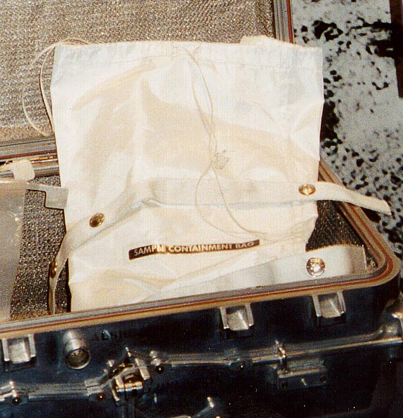 [That is, he doesn't want the Rover to fail because a battery or some other critical piece of equipment overheats.]123:26:37 Schmitt: I agree. (Pause) Okay, Bob, containment bags and two cameras are stowed in the ETB (Equipment Transfer Bag).