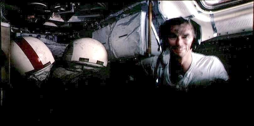 [Once they get hooked up to the LM ECS and get their PLSSs off, they will put their gloves back on so that they can depressurize the cabin, open the hatch, and jettison the PLSSs and other unneeded gear.]170:49:34 Cernan: I have never seen so much dirt and dust in my whole life. Ever. (Pause) Ron's not going to be able to see through either one of these helmet visors. (Laughs) Yes, he will.