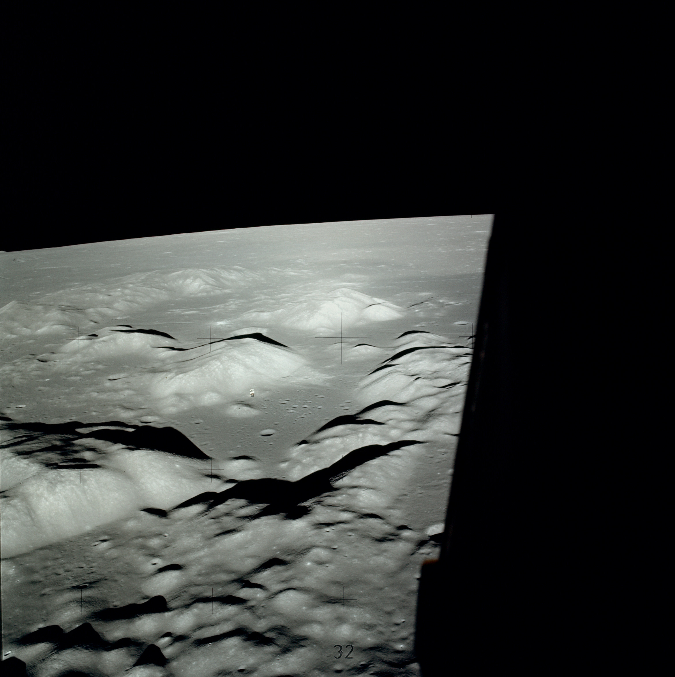 [Cernan - "We still wanted to slow ourselves down by firing forward but now we also had to keep ourselves from falling in too fast toward the surface. I don't know how much we pitched over, maybe from about sixty degrees to about twenty or thirty degrees (actually from 60 degrees to 20); but, when we did, all of a sudden, bam, the lunar surface filled up almost the entire window."]112:59:21 Cernan: And there it is, Houston. There's Camelot (Crater)!