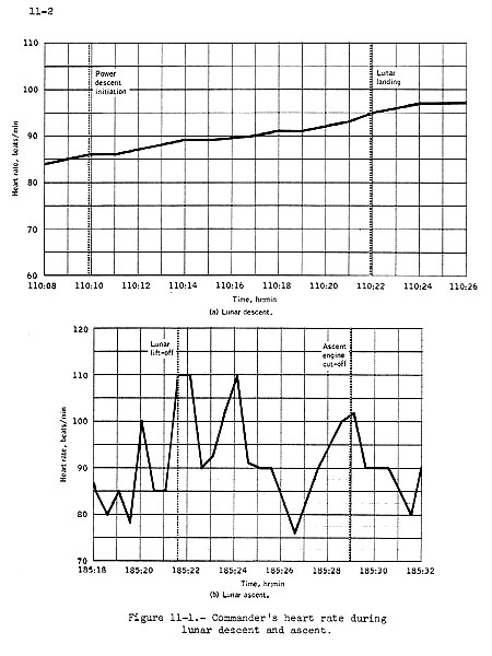 [During the descent, Gene's heart rate reached a peak of 97 beats per minute. The details are shown in the upper portion of Figure 11-1 in the Apollo 17 Mission Report. For comparison, Neil Armstrong's peak rate was 150 - due mostly to the stress of having to avoid West Crater - while the rates for the other three Commanders for whom we have data were 110 for Alan Shepard (Apollo 14), 105 for John Young (Apollo 16), and 97 for Dave Scott (Apollo 15).]
